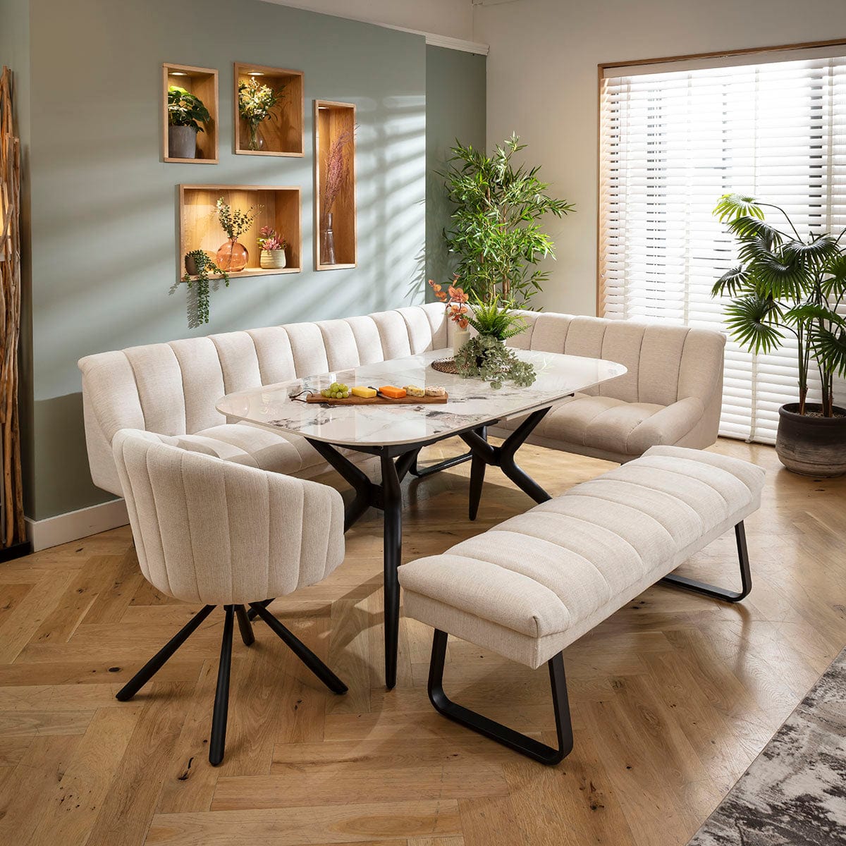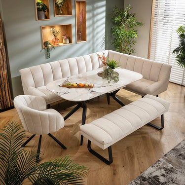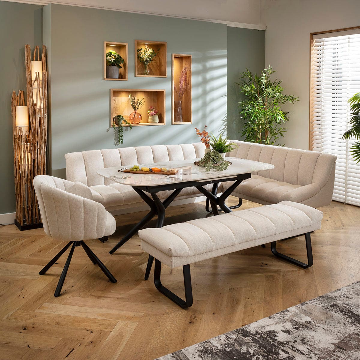 This 9 seater corner bench dining set includes our modern extending dining table, it has a luxury white gold ceramic marble top and metal legs, with a Harvey corner dining bench, backless bench and chair in super-soft stone fabric. This corner dining set is crafted for practicality and comfort.