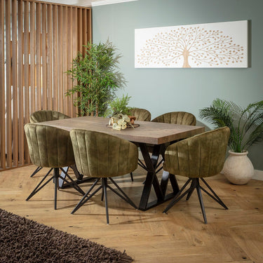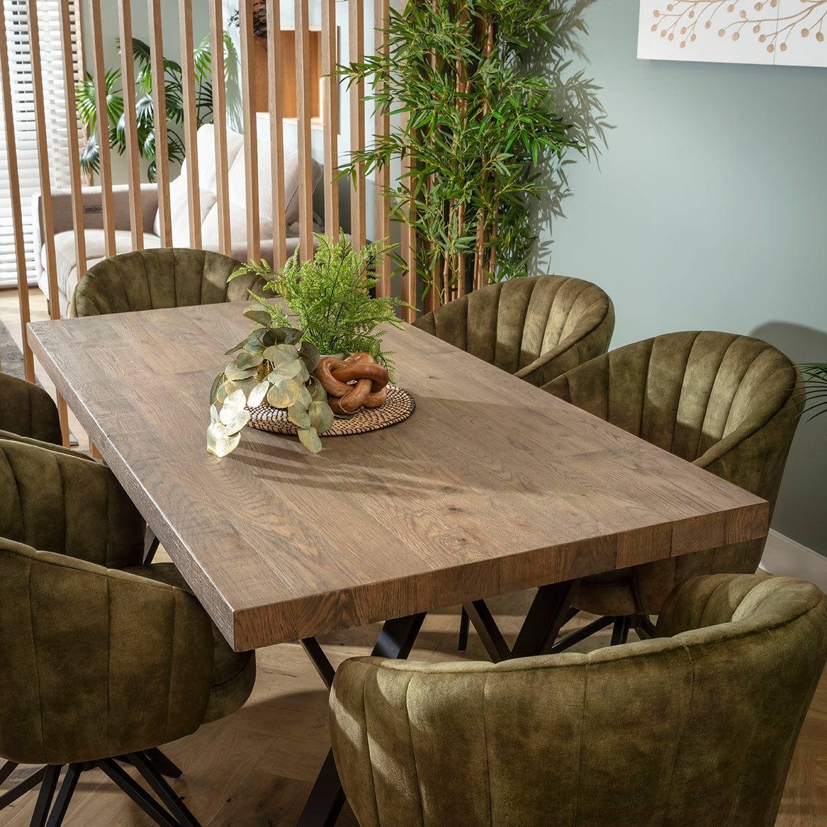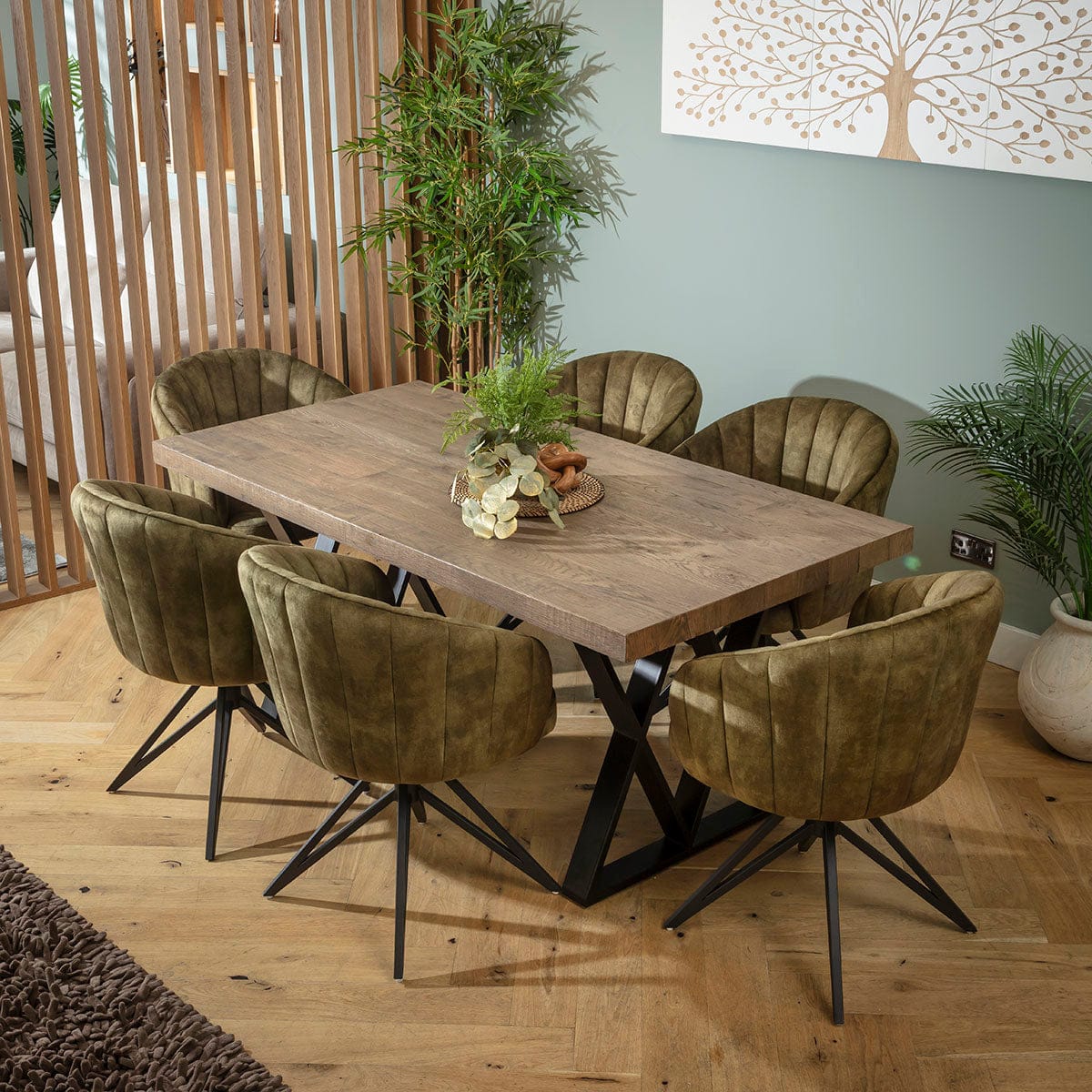 This 6 seater dining table and chair set includes a wooden dining table showcasing a reclaimed oak tabletop and unique black metal legs, with swivel chairs featuring elegant scalloped detailing and wrap-around arms, in rich green velvet. This modern dining set is crafted for durability and comfort.