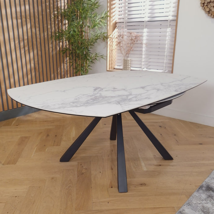 The Rudie large round extendable dining table combines cutting-edge design with premium materials to create a true centrepiece for any modern home. A bold and luxurious textured matte white ceramic dining table with light grey veining, it’s both stylish and practical. The large extendable round dining table showcases a truly unique mechanism - simply unlatch and rotate the tabletop to reveal hidden extension leaves that glide out and lift smoothly into place - a feature as impressive as it is functional. Supported by a solid 90x90cm black metal base, it’s a sturdy, modern statement for 8 guests.