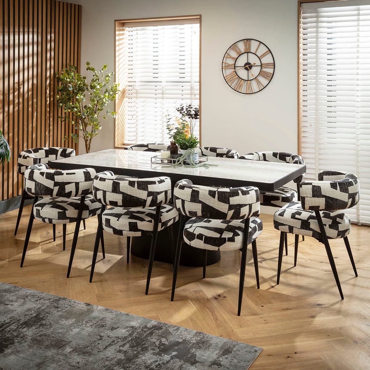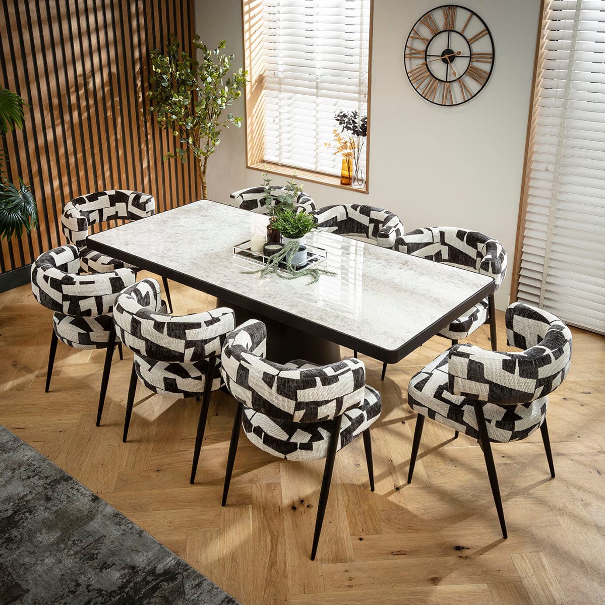This 8 seater dining table and chair set includes a contemporary dining table crafted from premium black oak and grey marble-effect ceramic, with unique black dining chairs that make a statement featuring a white textured weave and soft chenille. This modern dining set is crafted for durability and comfort.