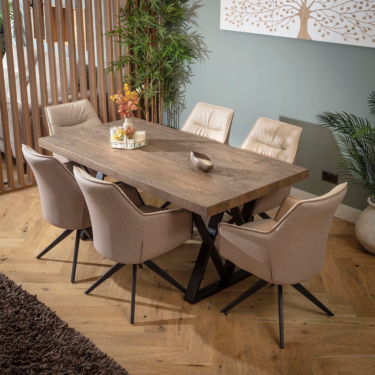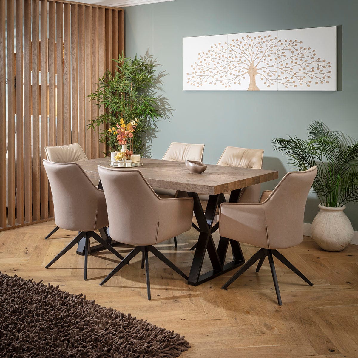 This 6 seater dining table and chair set includes a wooden dining table showcasing a reclaimed oak tabletop and unique black metal legs, with cream faux leather dining chairs with arms, featuring fabric accents and a rotating swivel base. This modern dining set is crafted for durability and comfort.