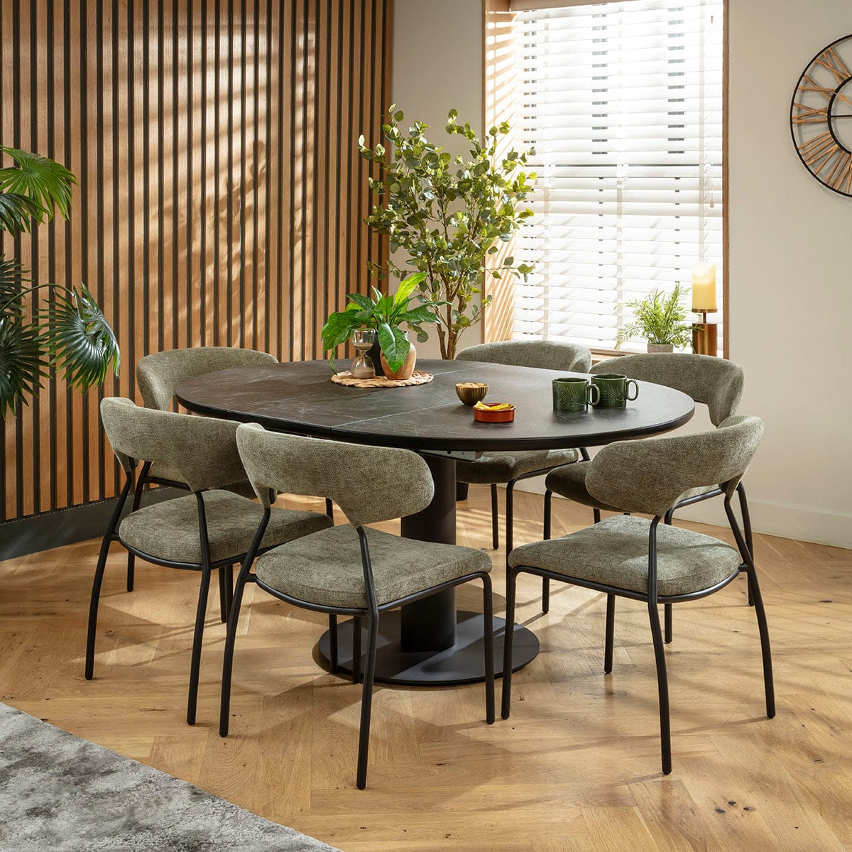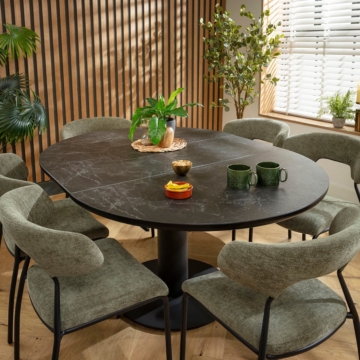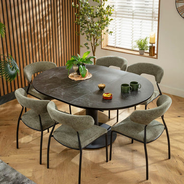 This 6 seater dining table and chair set includes a black round dining table boasting a marble-effect top that extends into an oval dining table, with modern dining chairs combining a black metal frame and green upholstered seat and backrest. This modern dining set is crafted for durability and comfort.