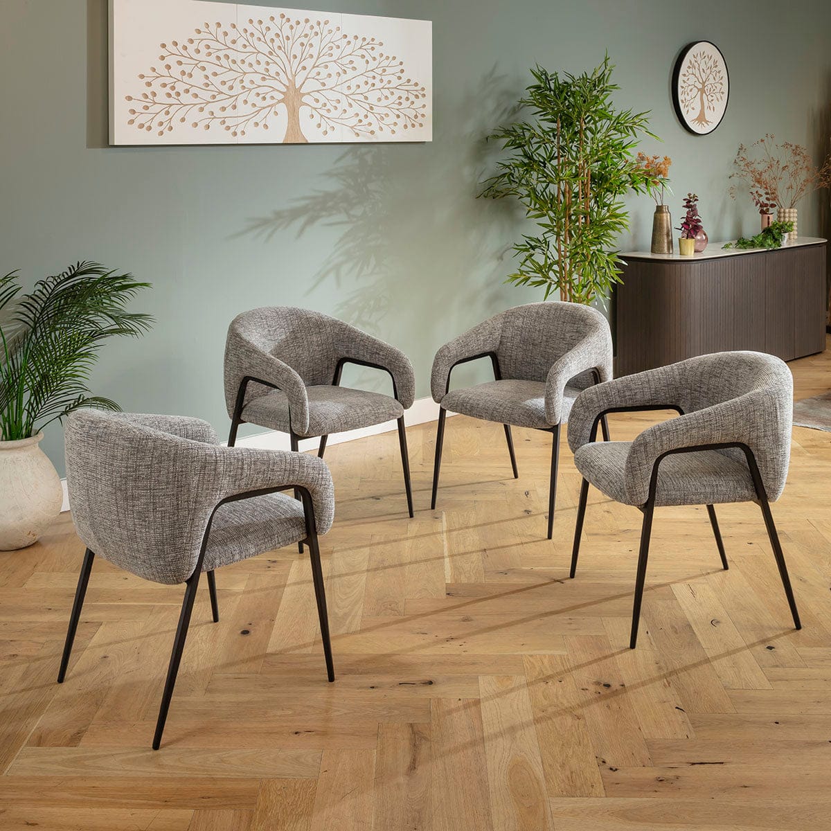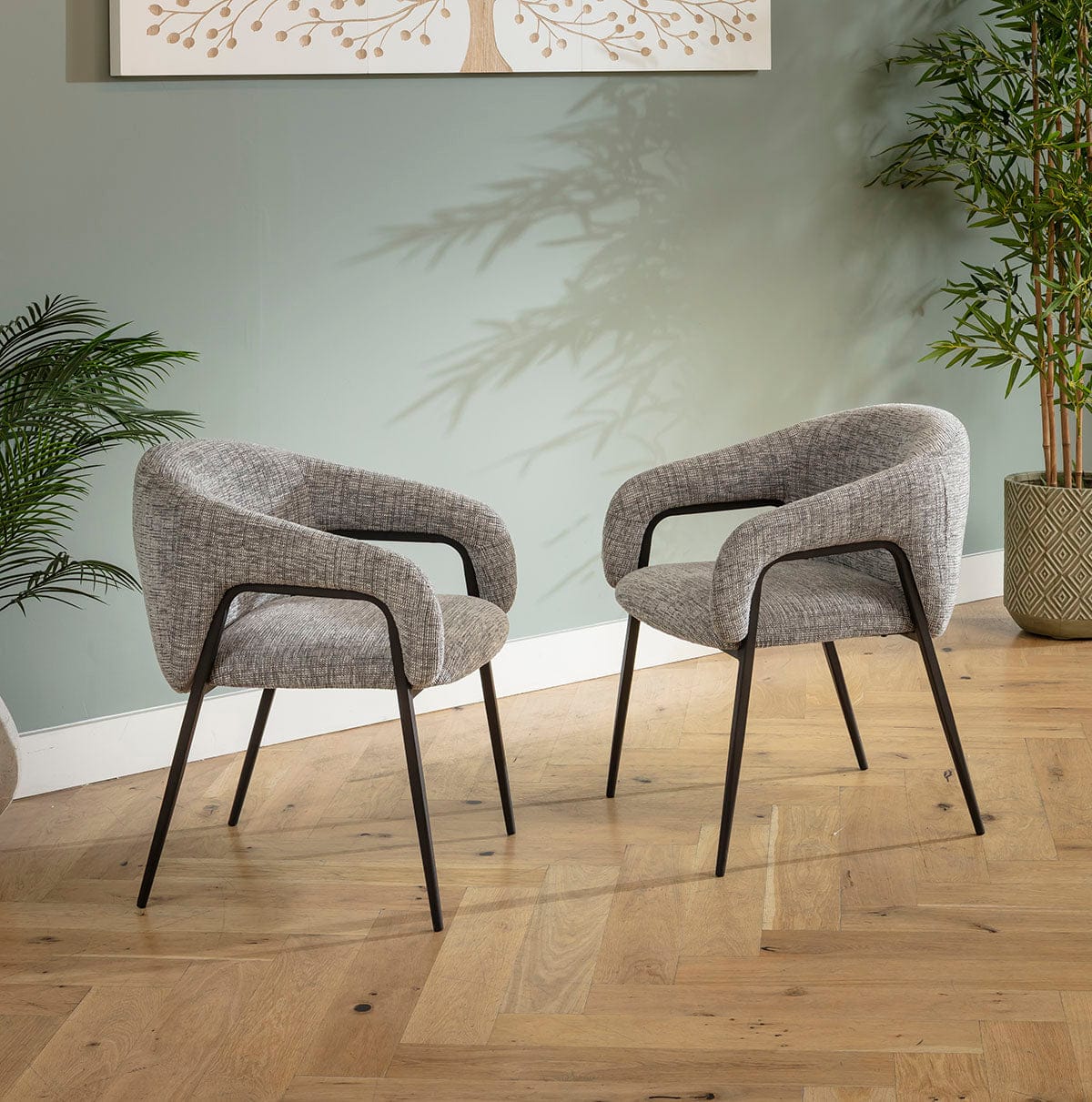 The Peyton dining chair showcases a modern silhouette with mouse grey fabric upholstery in a soft, hardwearing finish. Its carver design with arms, low-profile back and supportive 48cm seat height offer excellent comfort. Completed with a black metal frame featuring a unique arm cut-out and slim legs, it delivers a fresh, contemporary shape ideal for modern interiors.