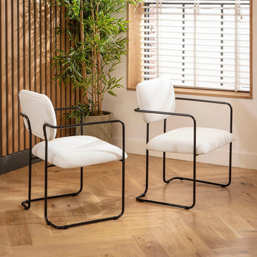 Elevate your dining space with this modern cream dining chair. Featuring a sleek industrial design, these upholstered dining chairs combine a carver style with wireframe arms and legs for a contemporary touch. Perfect for any modern dining room, these chairs are built for style and comfort.