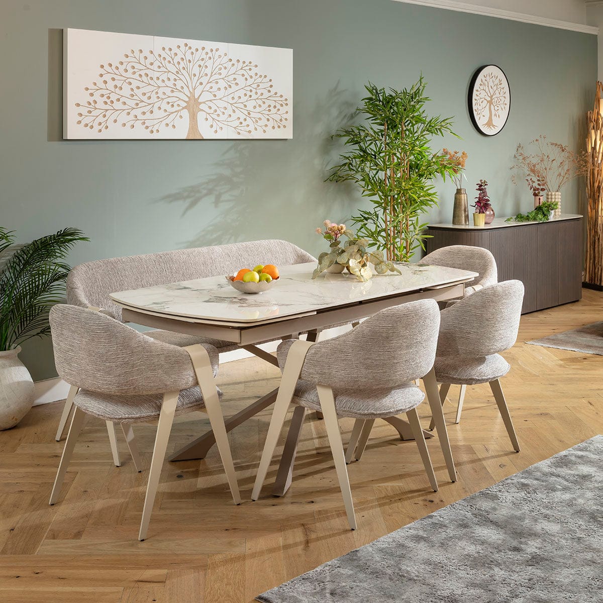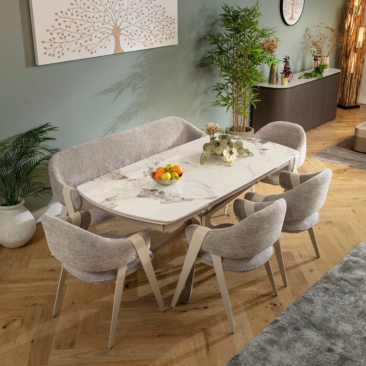 This 7 seater bench dining set includes a marble-effect extendable dining table that blends style with expert engineering in beige and white, with a Freya dining bench featuring a supportive backrest, plus 4 chairs in super-soft grey fabric. This modern dining set is crafted for practicality and comfort.