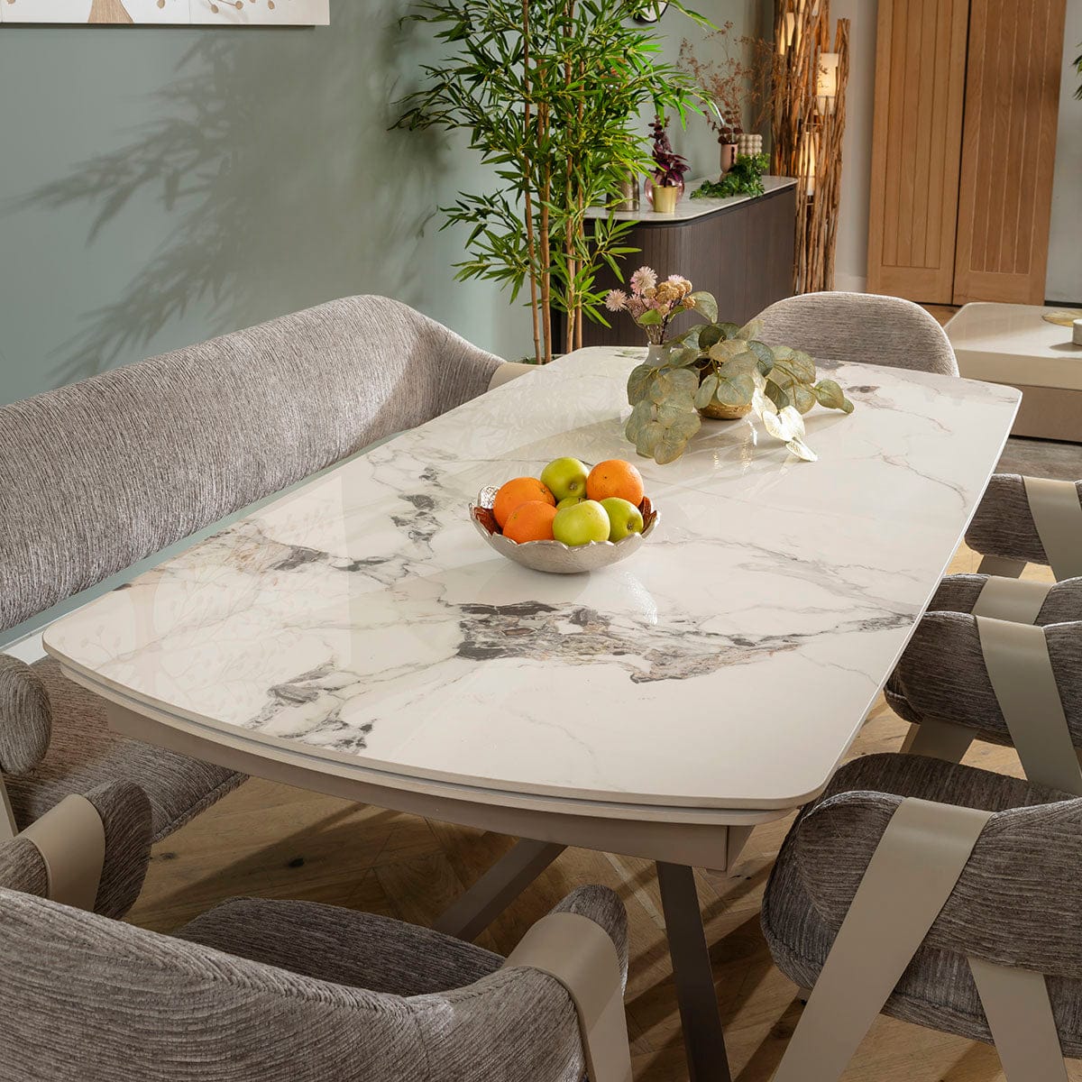 The large Olive extendable dining table features a unique colour palette, this piece showcases a white ceramic marble top with elegant veining and a smooth, polished finish. The ultra-durable ceramic resists scratches, stains and heat, while the beige-painted metal base introduces a distinctive modern silhouette. Rounded corners soften the form, and the generous 7 seat layout brings inviting versatility. Sized at 160cm × 90cm and extending to 200 or 240cm, the table uses pull-out leaves at each end, allowing either or both to be used without creating a centre gap. Premium ceramic and high-grade steel deliver lasting strength, reflecting our Quatropi quality promise.