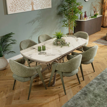 This 6 seater dining table and chair set includes a marble-effect extendable dining table that blends style with expert engineering in beige and white, with a Freya dining bench featuring a supportive backrest, plus 4 chairs in super-soft green fabric. This modern dining set is crafted for durability and comfort.