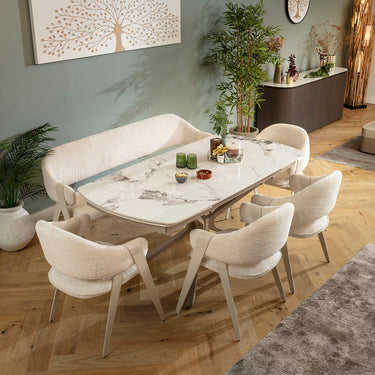 This 7 seater bench dining set includes a marble-effect extendable dining table that blends style with expert engineering in beige and white, with a Freya dining bench featuring a supportive backrest, plus 4 chairs in super-soft cream fabric. This modern dining set is crafted for practicality and comfort.
