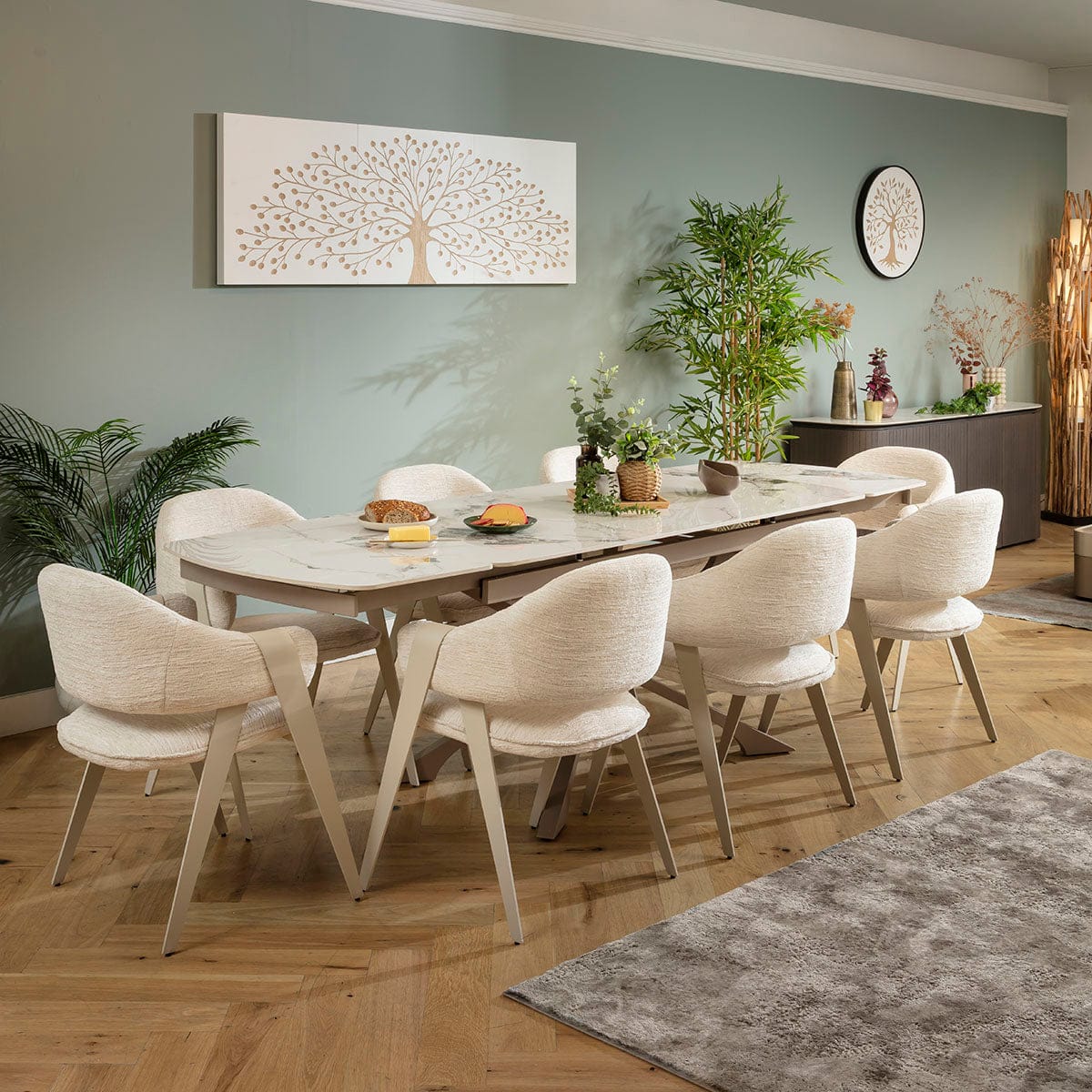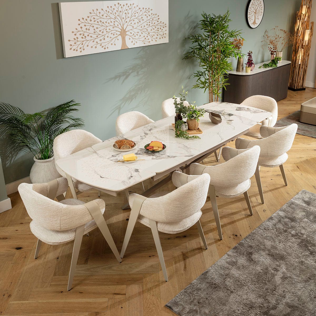 The large Olive extendable dining table features a unique colour palette, this piece showcases a white ceramic marble top with elegant veining and a smooth, polished finish. The ultra-durable ceramic resists scratches, stains and heat, while the beige-painted metal base introduces a distinctive modern silhouette. Rounded corners soften the form, and the generous 8 seat layout brings inviting versatility. Sized at 160cm × 90cm and extending to 200 or 240cm, the table uses pull-out leaves at each end, allowing either or both to be used without creating a centre gap. Premium ceramic and high-grade steel deliver lasting strength, reflecting our Quatropi quality promise.