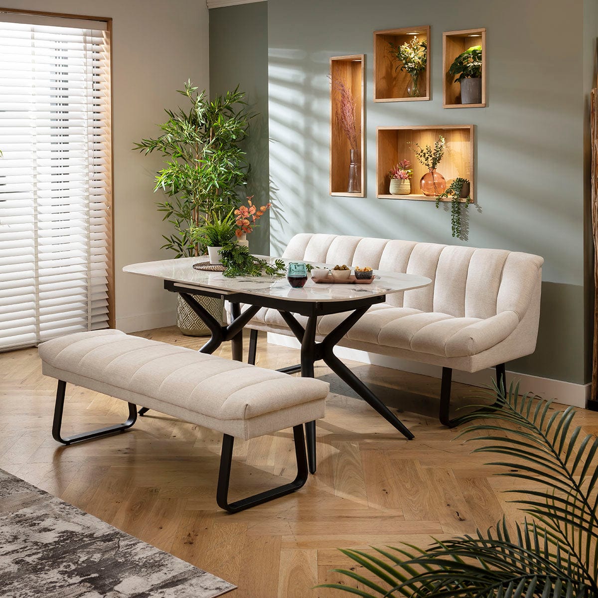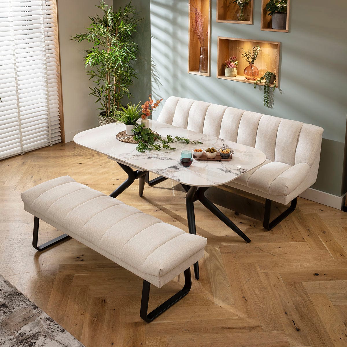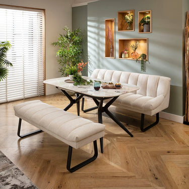 This 6 seater bench dining set includes our modern extending dining table, it has a luxury white gold ceramic marble top and metal legs, with two dining benches - one backless and the other with a backrest in super-soft stone fabric. This modern dining set is crafted for practicality and comfort.