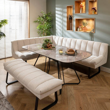 This 8 seater corner bench dining set includes an extendable dining table boasting a grey ceramic top with a glossy marble-effect finish, with a Harvey corner dining bench and a backless bench in super-soft stone fabric. This corner dining set is crafted for practicality and comfort.