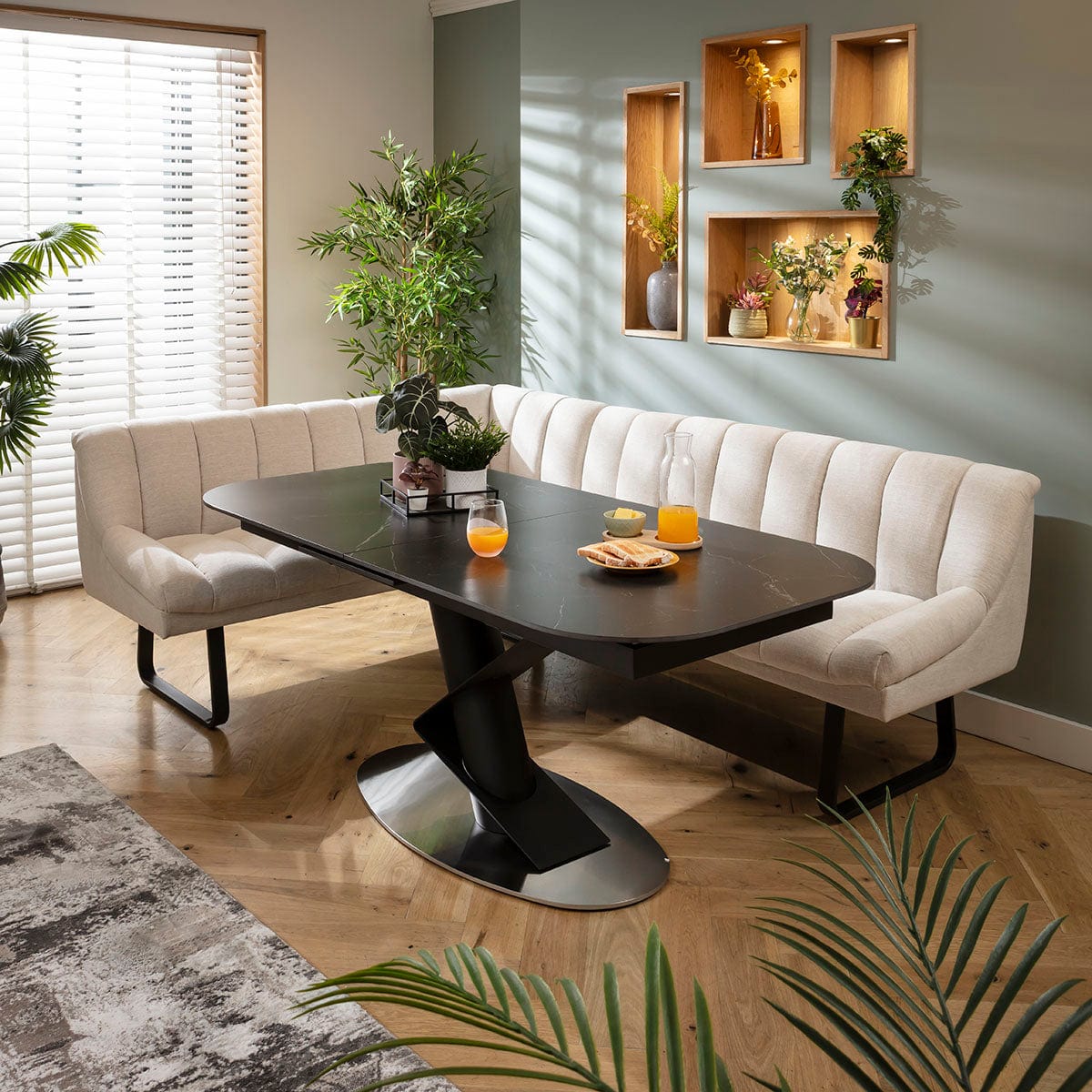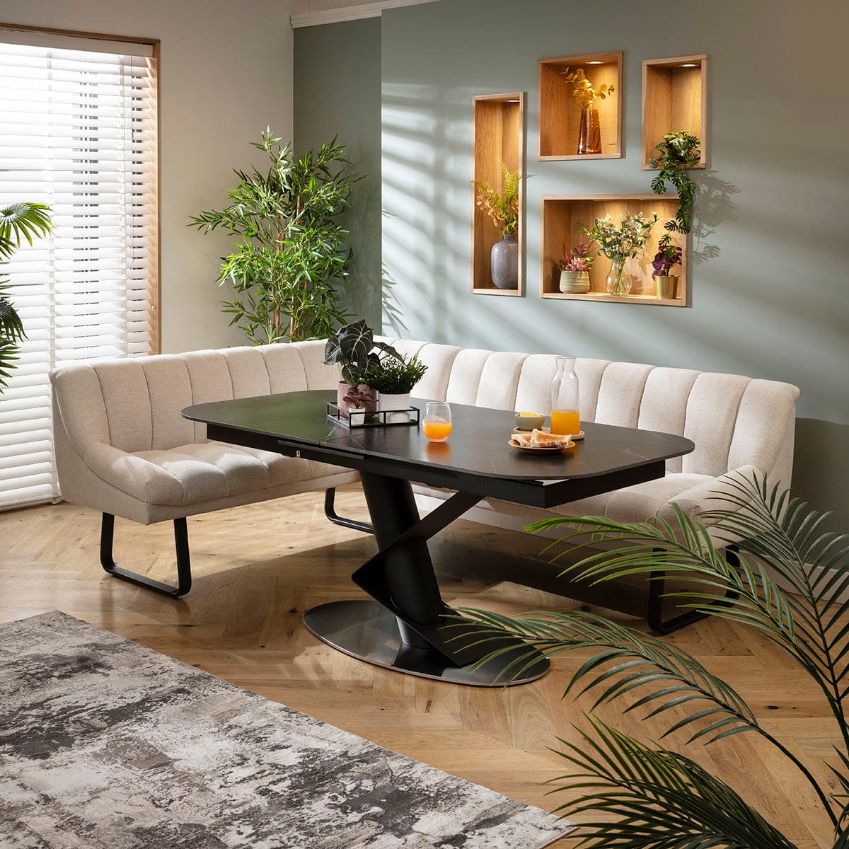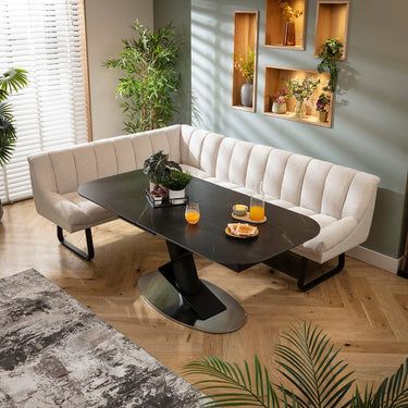 This 5 seater corner bench dining set includes this extendable ceramic marble dining table embellishing a bold pedestal with a geometric design, with the Harvey corner dining bench in a super soft stone fabric and black metal legs. This corner dining set is crafted for practicality and comfort.