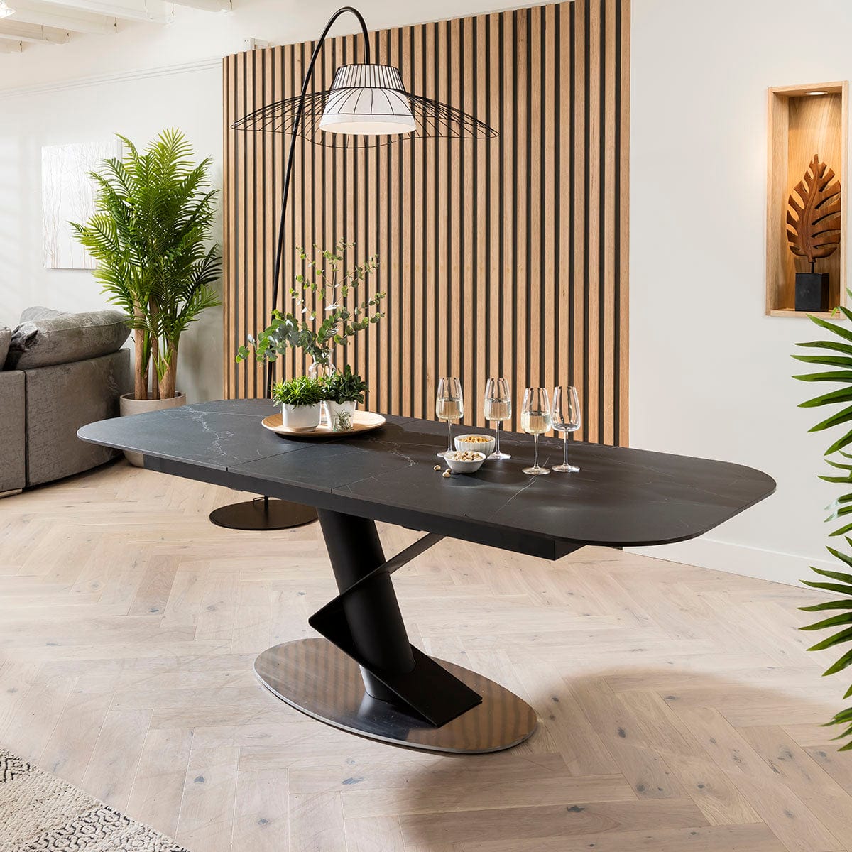 Large modern dining table sets where the whole family can come together is what we specialise in. This extendable ceramic dining table pulls inspiration from modern designer-chic that is sleek and sophisticated, with a truly modern design featuring soft, rounded edges and a bold pedestal with a geometric feature.