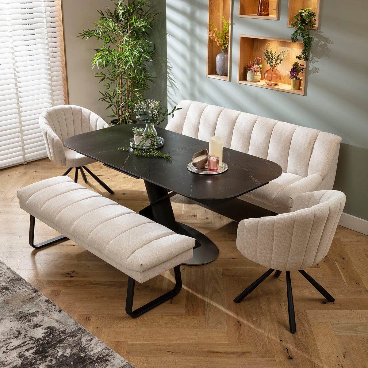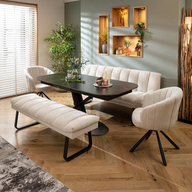 This 8 seater bench dining set includes this extendable ceramic marble dining table embellishing a bold pedestal with a geometric design, with a backless bench, bench with a backrest and two chairs in super-soft stone fabric. This modern dining set is crafted for practicality and comfort.