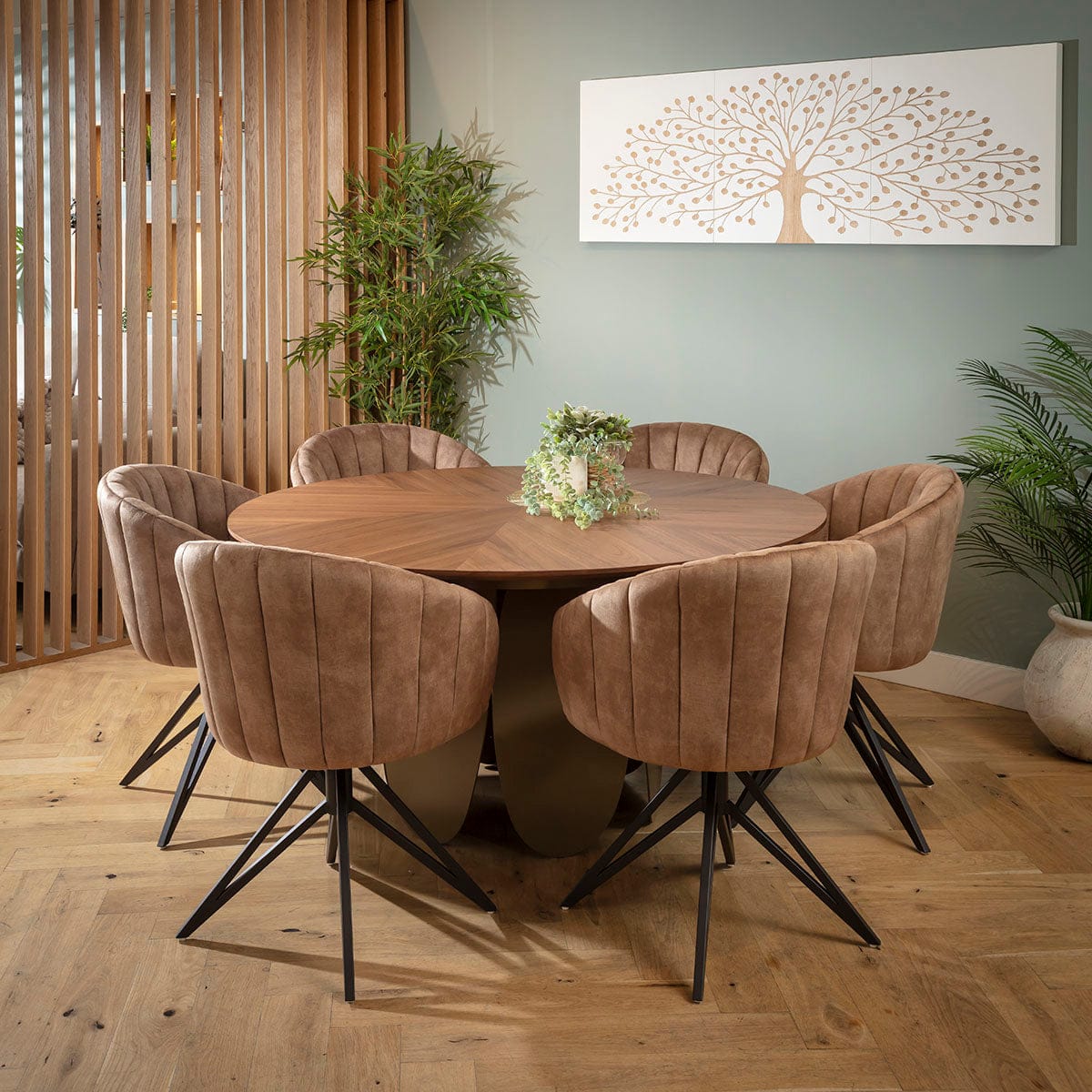 This 6 seater dining table and chair set includes a luxury round wooden dining table adorned with a sculpted metal base in champion gold, with swivel chairs featuring elegant scalloped detailing and wrap-around arms, in warm brown velvet. This modern dining set is crafted for durability and comfort.