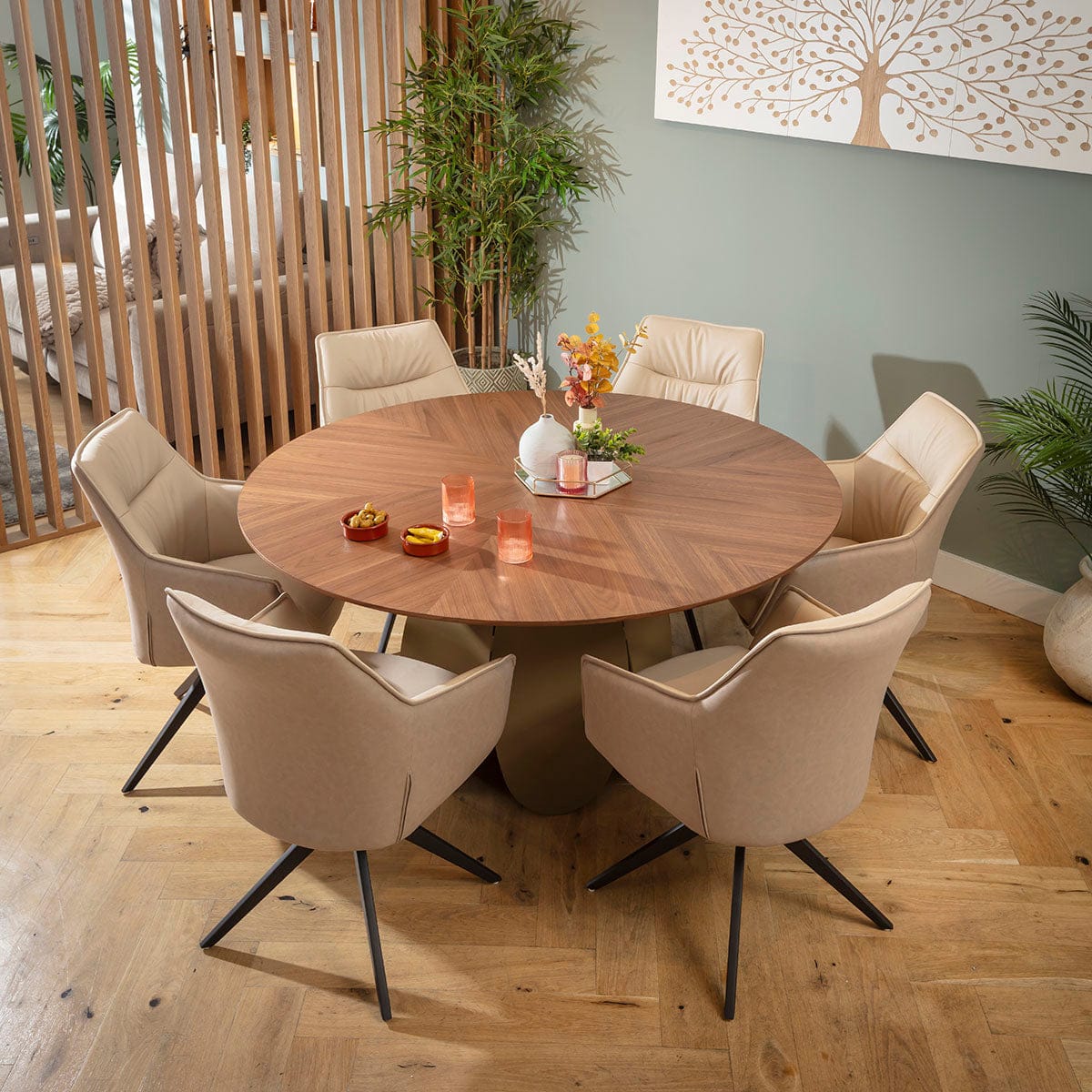 The Phoenix 6 seater dining table boasts a striking round top measuring 150cm x 150cm. The tabletop is crafted from walnut veneer, chosen for its rich depth and resilience. Its surface is tough and durable, ideal for daily use. A sculpted metal base with a powder-coated champion gold finish brings refinement and stability. Built from premium materials, this modern round dining table is made to last, supporting the demands of busy homes.