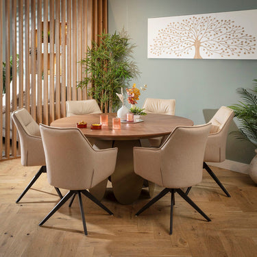 This 6-seater dining table and chair set includes a luxury round wooden dining table with a sculpted metal base in champion gold, cream faux-leather dining chairs with arms, fabric accents, and a rotating swivel base. This modern dining set is crafted for durability and comfort.