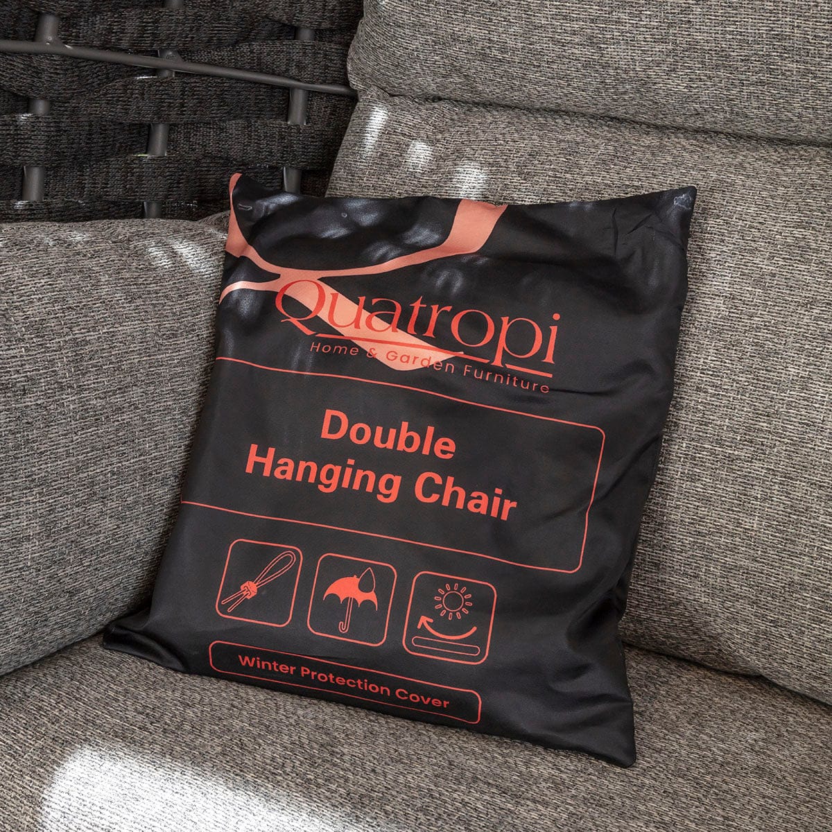 This two seater, spacious seating piece is formed from a light yet durable aluminium basket, finished in charcoal grey Sundowner Signature rope weave - a premium outdoor material. Sofa-inspired luxury cushions in smoke grey fabric provide indulgent comfort and should be stored when not in use. Suspended from a grey powder-coated steel frame for superior strength, its sleek silhouette reflects a market-leading design. A beige weather cover is included to guard against garden debris.