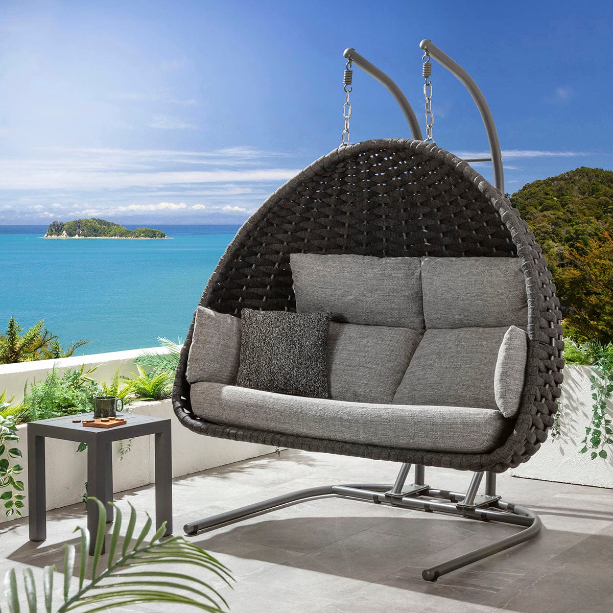 The Sundowner double hanging egg chair in smoke grey is a modern garden egg chair crafted for stylish outdoor living. This grey two person garden egg chair combines the appeal of a double hanging chair with the comfort of a luxury swing chair. Designed as a modern garden swing chair in sleek grey tones, it delivers the presence of a luxury 2 seater outdoor hanging chair while elevating patios, terraces, and landscaped spaces with contemporary sophistication.