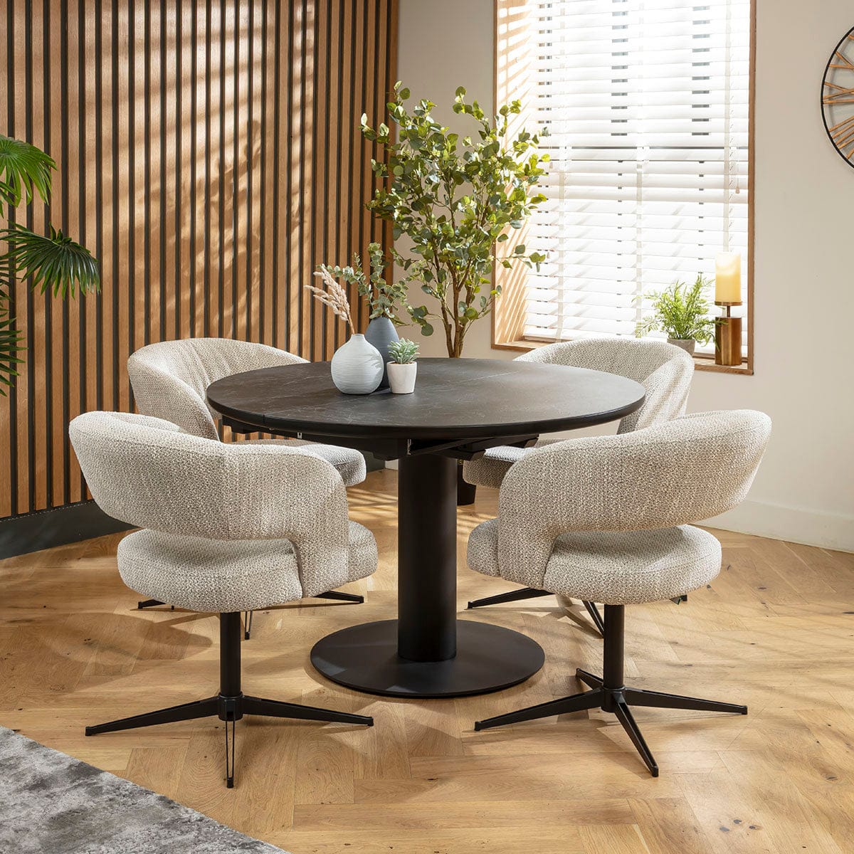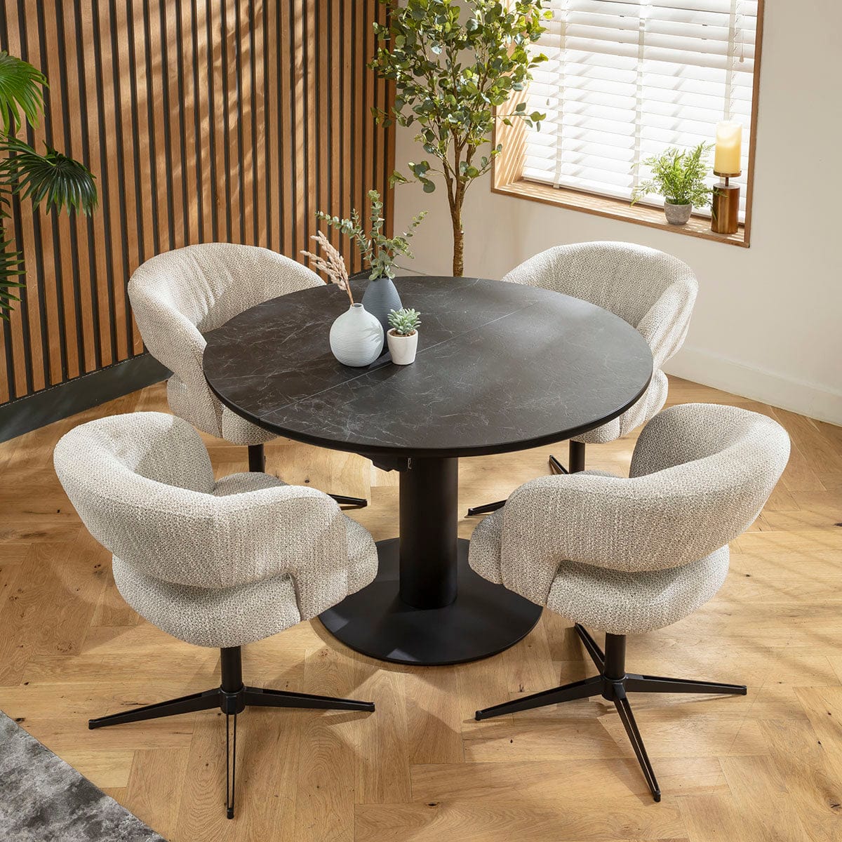 This 4 seater dining table and chair set includes a black round dining table boasting a marble-effect top that extends into an oval dining table, with modern swivel dining chairs boasting Scandi design and durability in grey woven fabric. This modern dining set is crafted for durability and comfort.