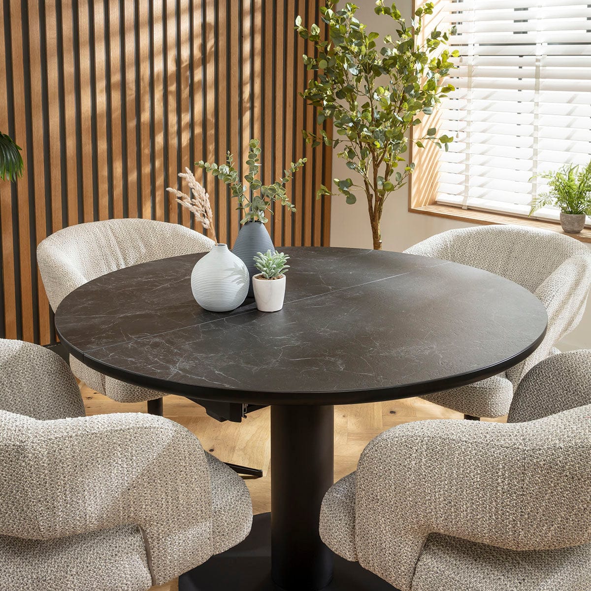 The Venus modern round dining table blends sleek style with everyday practicality. A round extendable dining table, it transforms effortlessly from 120cm to a 160cm x 120cm oval dining table for six. Crafted with a durable black marble-effect ceramic top, it’s heat, scratch, and stain resistant, with a slim pedestal stem and black powder-coated base - a stunning round dining room table for contemporary homes. The table features a smart self-stowing leaf hidden beneath the tabletop. Simply unlatch and pull to reveal the handle, unfold the leaf, then push together and lock - extending the dining table in under 30 seconds. Smooth, secure, and designed for effortless everyday use.