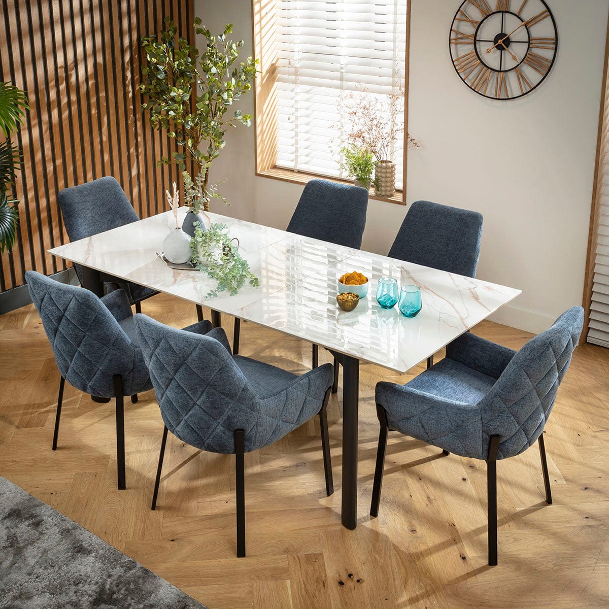 This 6 seater dining table and chair set includes a modern extendable dining table boasting a stunning white ceramic marble-effect tabletop, with blue chenille fabric dining chairs adorned with low sweeping arms a unique leg design. This modern dining set is crafted for durability and comfort.