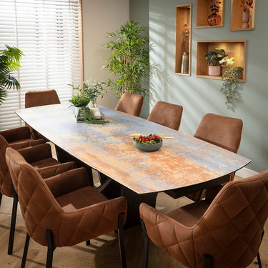 The Zelda extendable dining table combines industrial style with premium craftsmanship. Extending from 180cm to 260cm, it comfortably seats 8 people. The rustic blue and orange printed ceramic top is both artistic and practical - resistant to scratches, stains, and heat. Its interwoven black metal pedestal base adds bold character, while the smooth one-handed extension system lets you expand the table with ease. Functional, striking, and built to last.