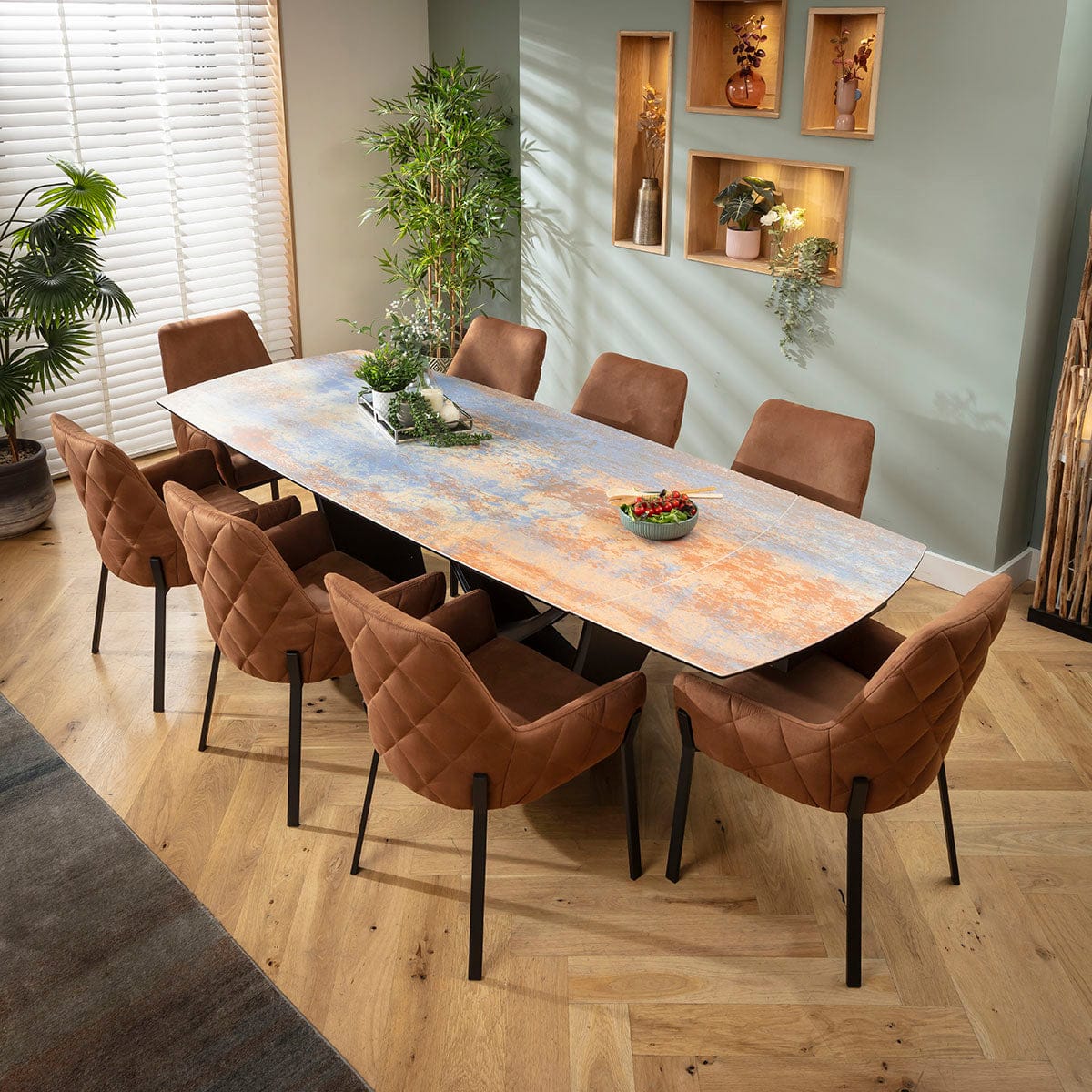 This 8 seater dining table and chair set includes an extendable dining table combining a blue and orange ceramic top with a metal pedestal base, with brown suede-look fabric dining chairs adorned with low sweeping arms a unique leg design. This modern dining set is crafted for durability and comfort.