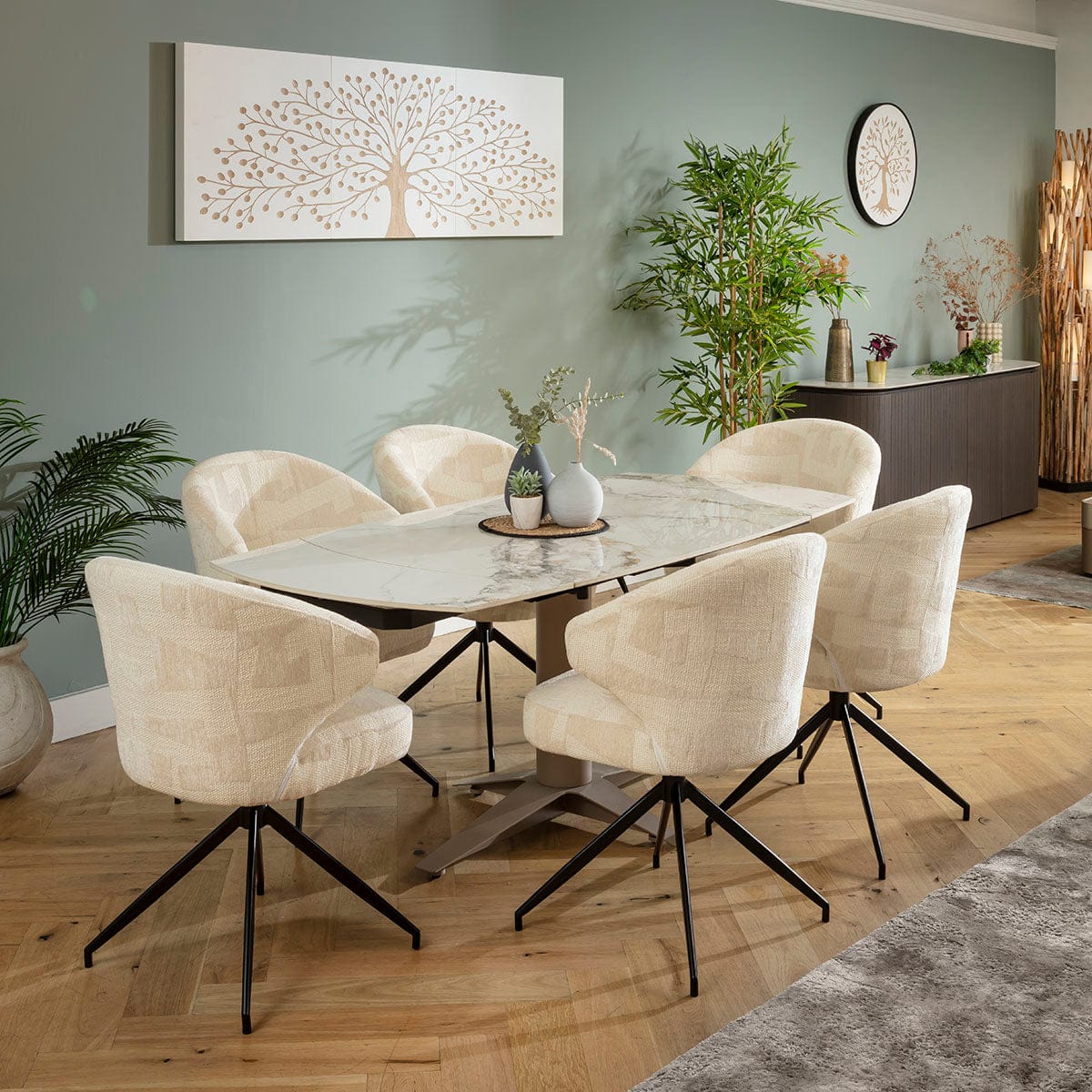 This 6 seater dining table and chair set includes a marble-effect extendable dining table that blends style with expert engineering in beige and white, with unique cream dining chairs that make a statement featuring textured weave and soft chenille. This modern dining set is crafted for durability and comfort.