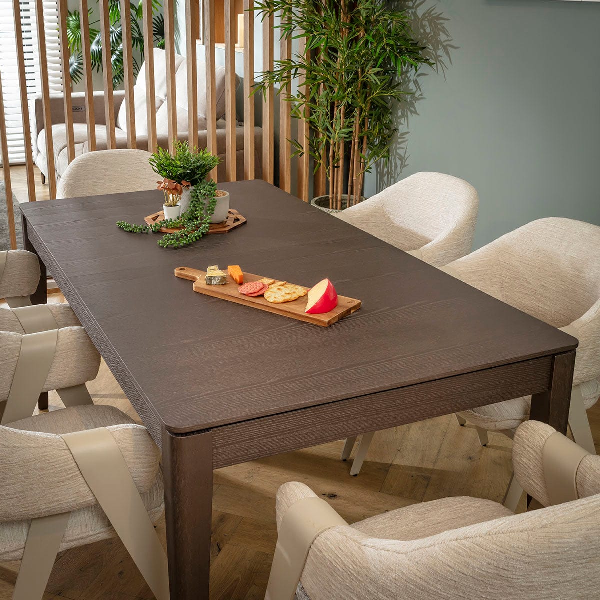 The Ruben extending 6 seater dining table showcases a modern design with simple, bold lines. The rectangular wooden table features solid wood legs and a brown oak veneer finish that feels fresh and vibrant. A tactile wood grain, super sturdy build and compact form complete this refined statement piece. Closed, the table measures 168cm, extending to 248cm when required, with a 90cm depth and 76cm height. It includes two extension leaves that stow neatly on a cradle beneath the tabletop. Unlatch, glide open, align the pins and secure again - allowing smooth extension or retraction in under thirty seconds.