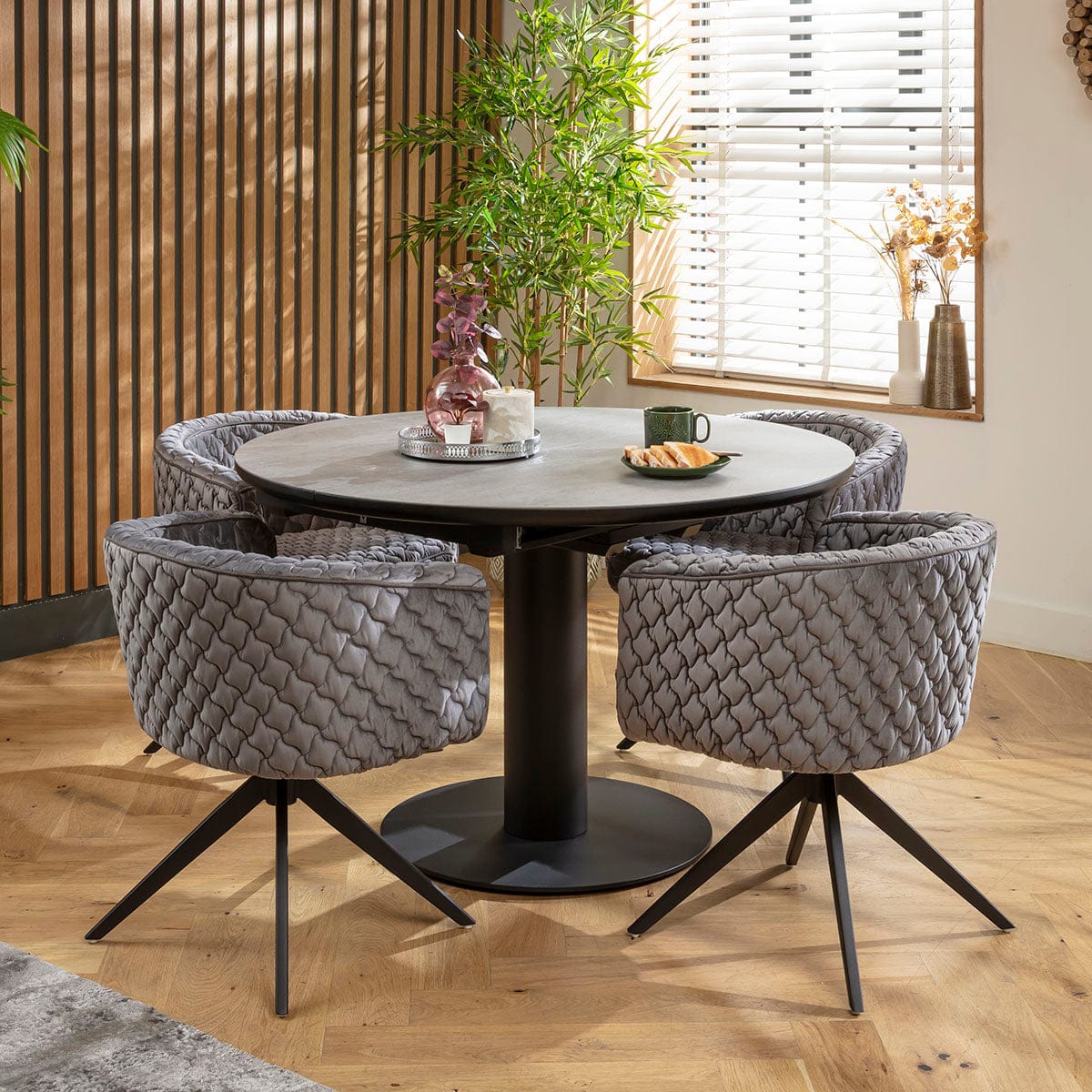 This 4 seater dining table and chair set includes a grey round dining table boasting a stone-effect top that extends into an oval dining table, with swivel dining chairs with arms for added comfort and grey velvet upholstery. This modern dining set is crafted for durability and comfort.