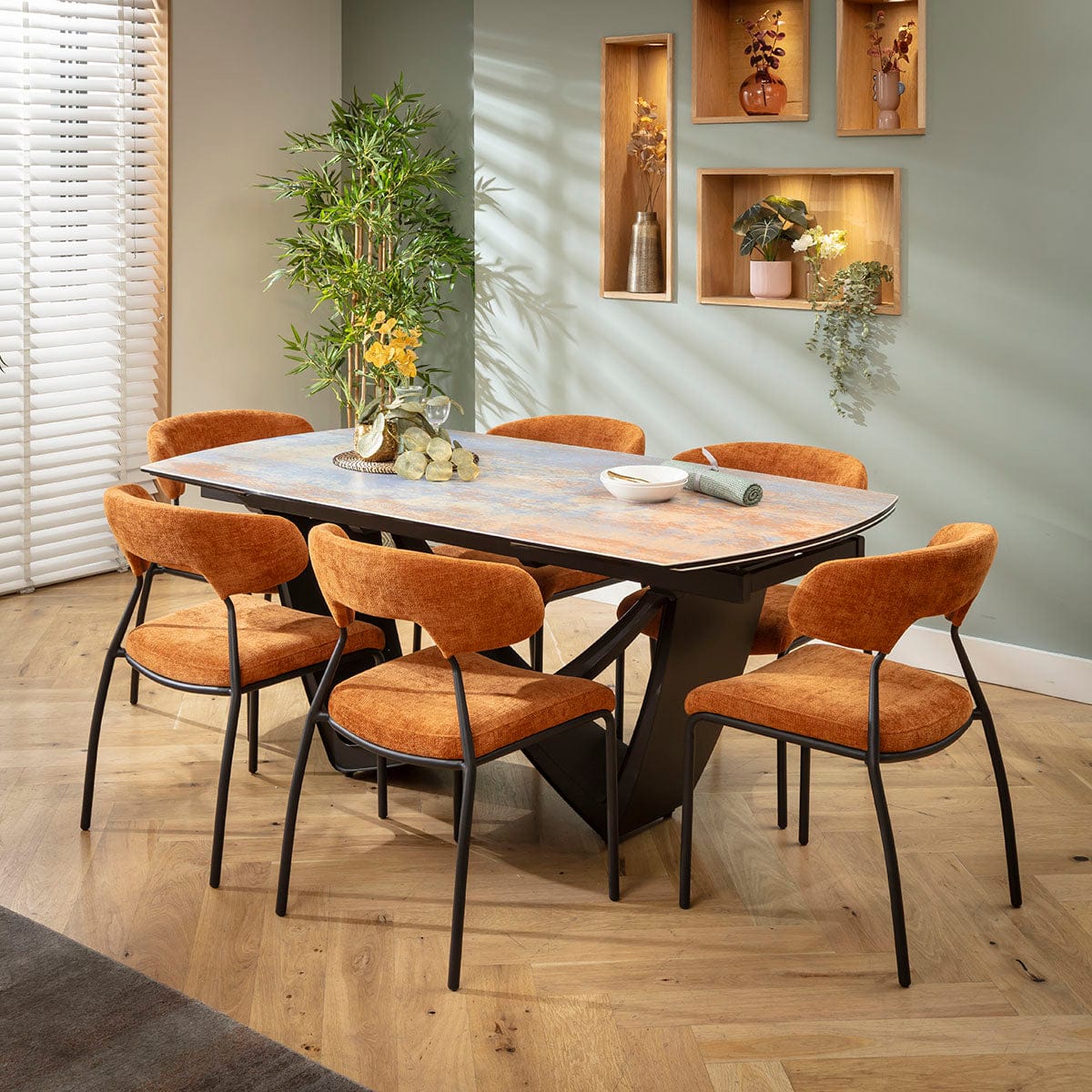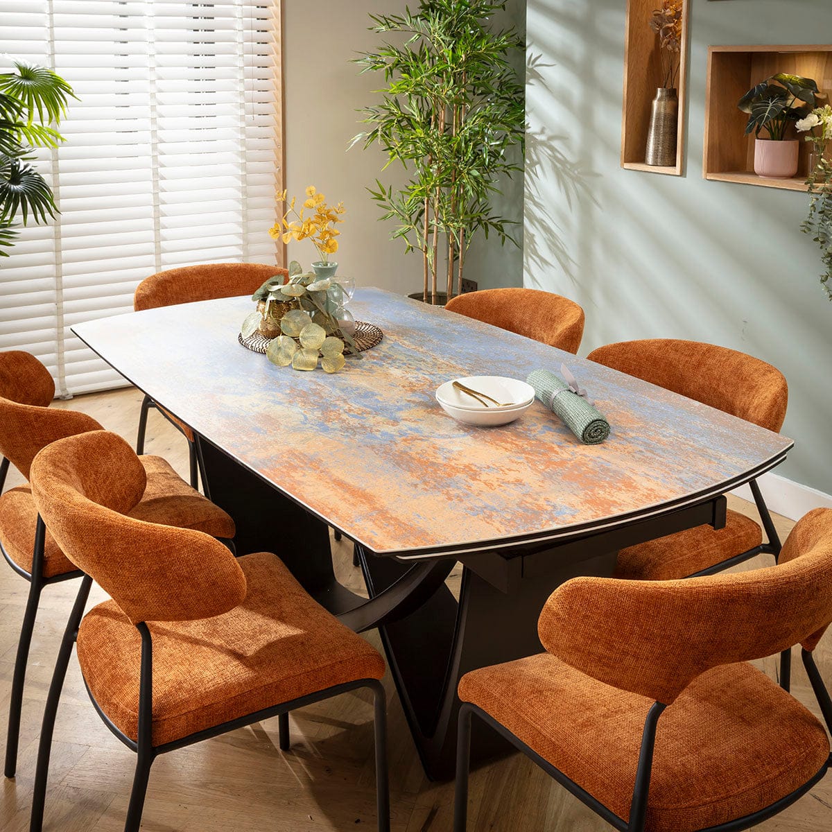 The Zelda extendable dining table combines industrial style with premium craftsmanship. Extending from 180cm to 260cm, it comfortably seats 6 people. The rustic blue and orange printed ceramic top is both artistic and practical - resistant to scratches, stains, and heat. Its interwoven black metal pedestal base adds bold character, while the smooth one-handed extension system lets you expand the table with ease. Functional, striking, and built to last.