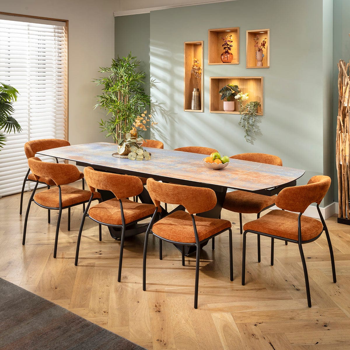 The Zelda extendable dining table combines industrial style with premium craftsmanship. Extending from 180cm to 260cm, it comfortably seats 8 people. The rustic blue and orange printed ceramic top is both artistic and practical - resistant to scratches, stains, and heat. Its interwoven black metal pedestal base adds bold character, while the smooth one-handed extension system lets you expand the table with ease. Functional, striking, and built to last.