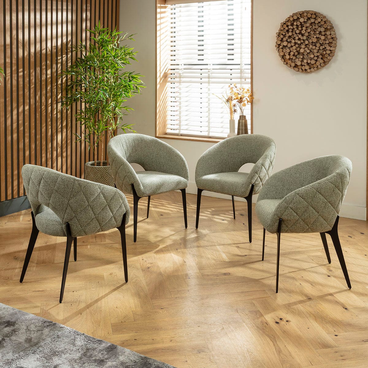 The 4 Piper green dining chairs combine bold design with lasting quality, offering the style and comfort you’d expect from a premium kitchen chair. The soft green fabric is woven for durability - diamond-quilted detailing on the back adds texture and depth. Thick, black blade-style metal legs rise into the seat - a showstopping detail that enhances both strength and visual appeal with a premium powder-coated finish.