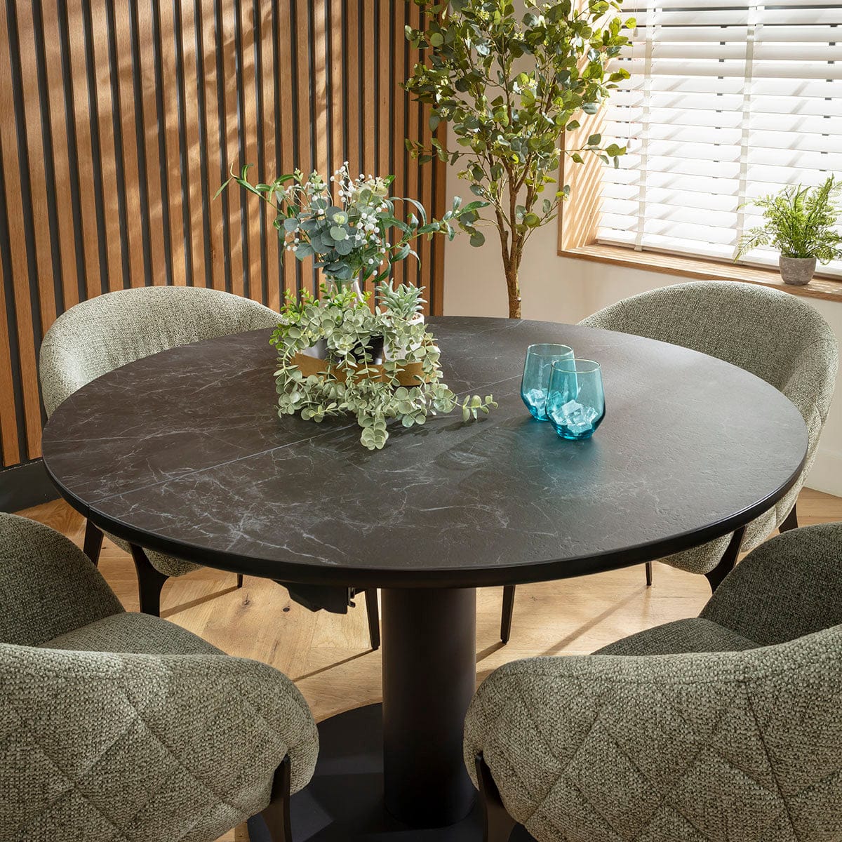 The Venus modern round dining table blends sleek style with everyday practicality. A round extendable dining table, it transforms effortlessly from 120cm to a 160cm x 120cm oval dining table for six. Crafted with a durable black marble-effect ceramic top, it’s heat, scratch, and stain resistant, with a slim pedestal stem and black powder-coated base - a stunning round dining room table for contemporary homes. The table features a smart self-stowing leaf hidden beneath the tabletop. Simply unlatch and pull to reveal the handle, unfold the leaf, then push together and lock - extending the dining table in under 30 seconds. Smooth, secure, and designed for effortless everyday use.