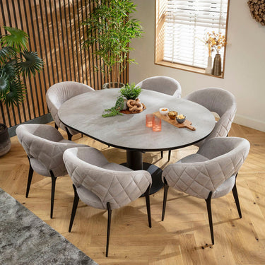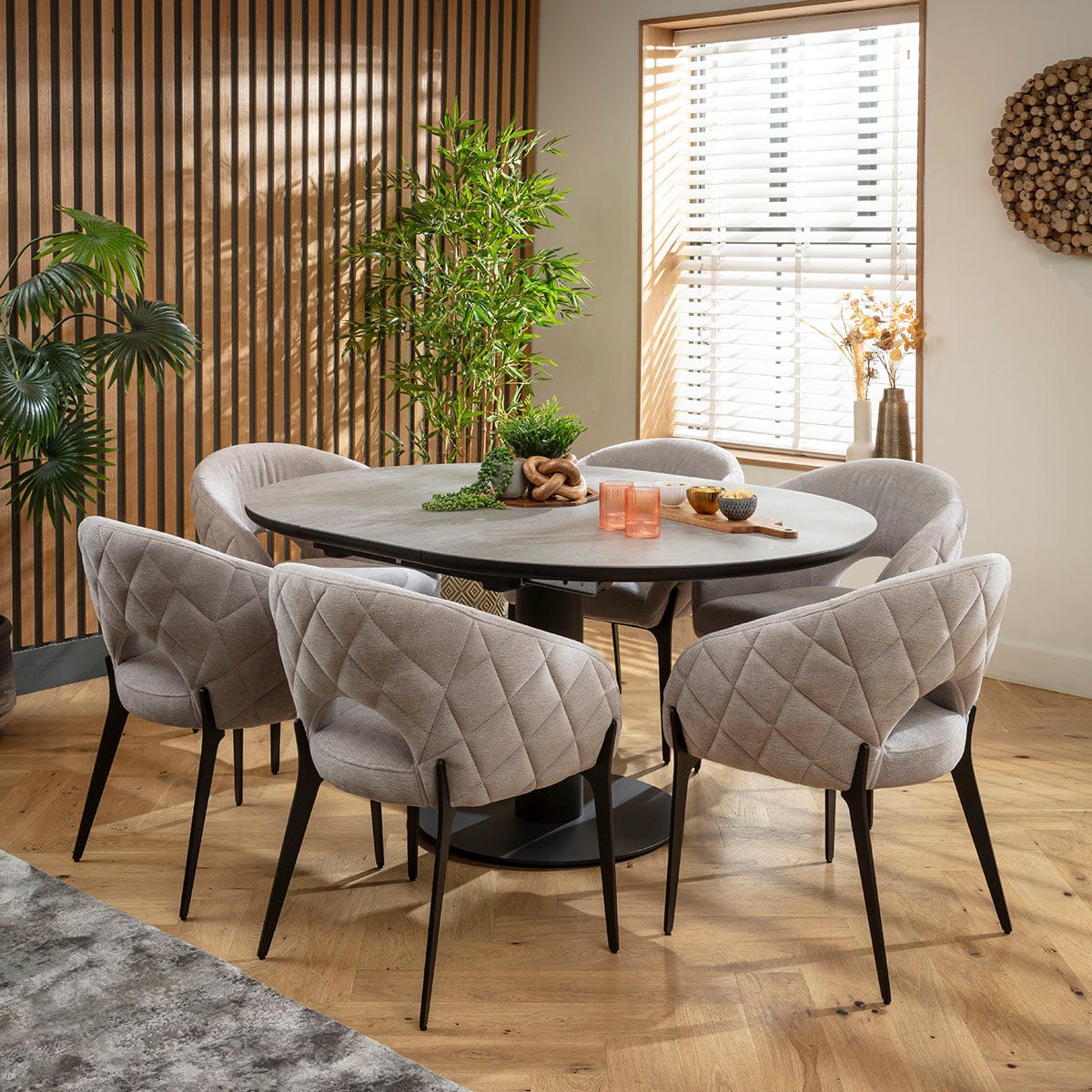 This 6 seater dining table and chair set includes a grey round dining table boasting a stone-effect top that extends into an oval dining table, with grey dining chairs boasting diamond-quilted detailing and black metal legs. This modern dining set is crafted for durability and comfort.