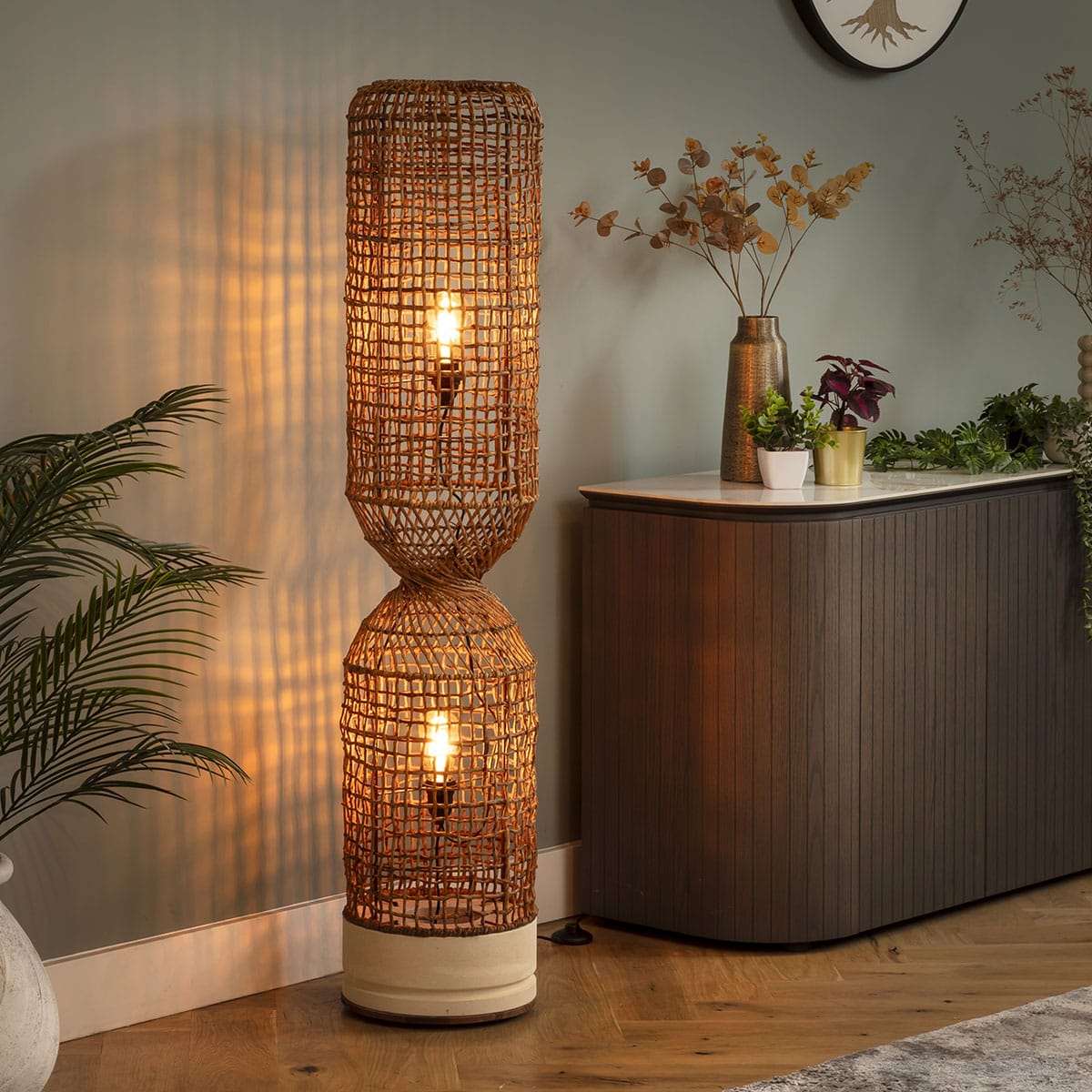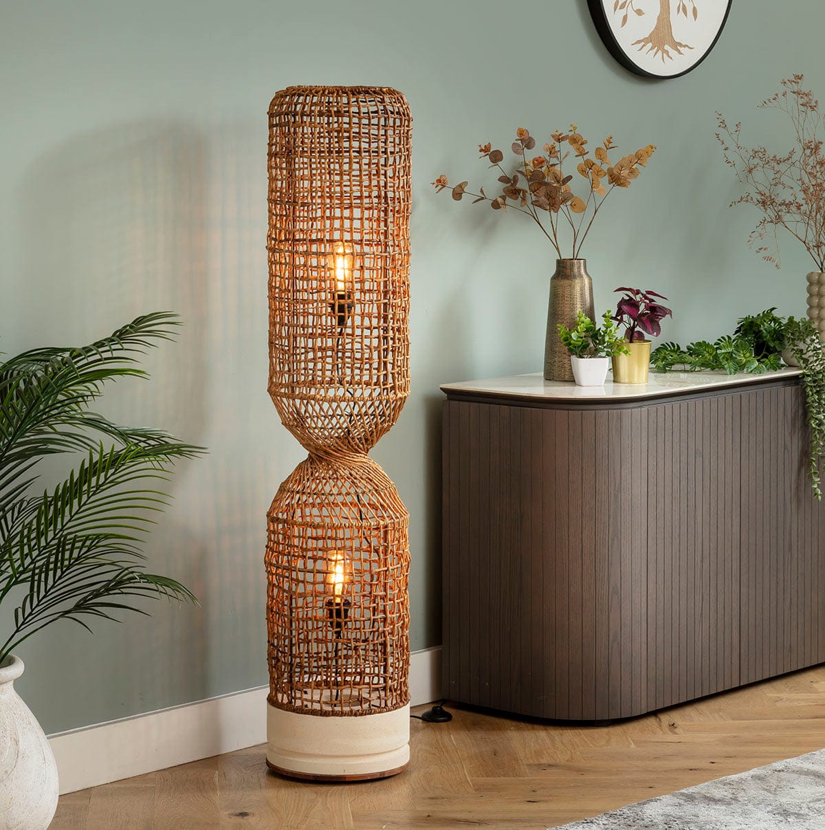 A modern statement with a tactile wicker design, this tall piece stands at 140cm and features a weighty stone base for stability. The round structure delivers a subtle rustic feel while casting a soft, inviting ambience. Designed for functionality and atmosphere, it requires two E27 bulbs (not included), creating layered illumination that accents your living space with effortless refinement.