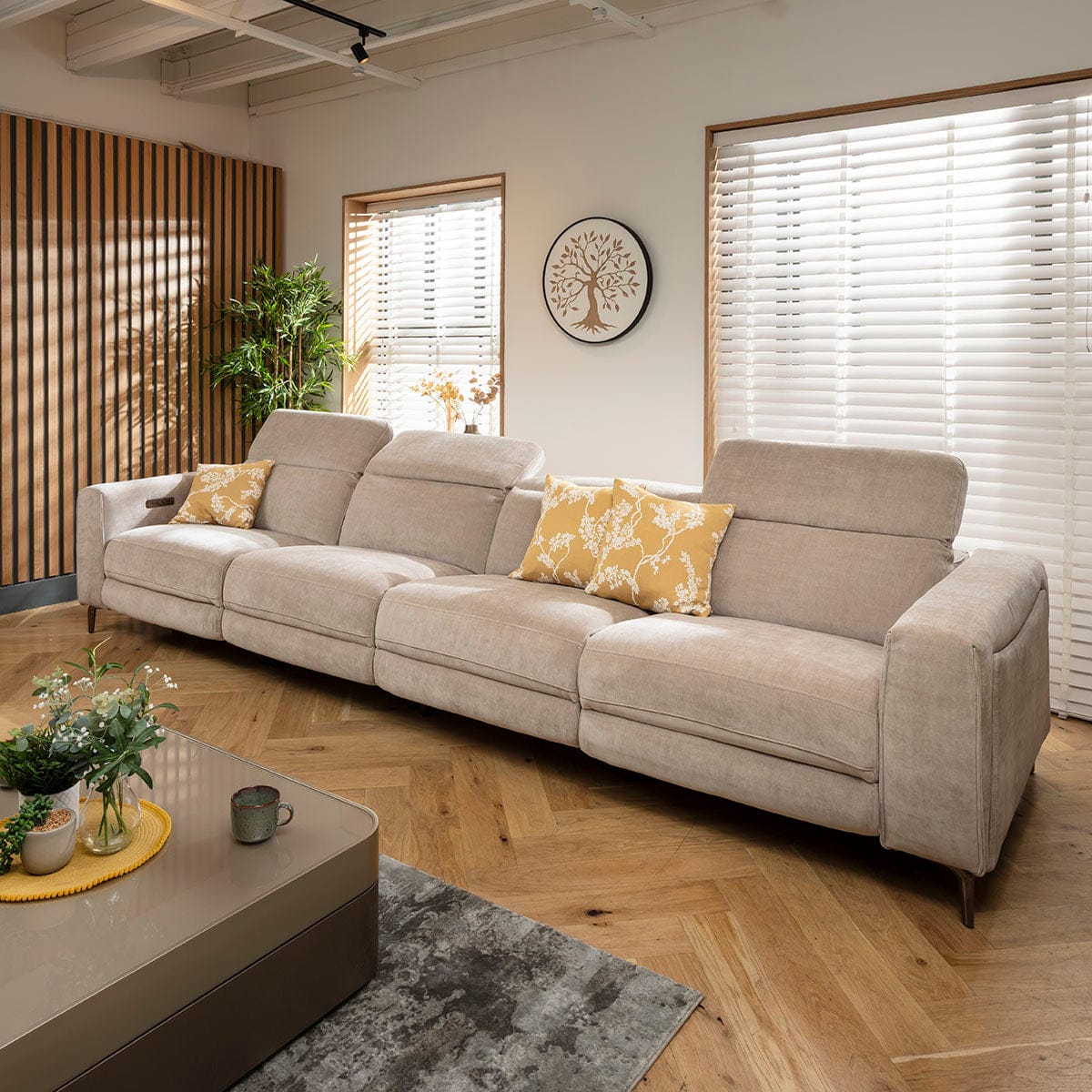 This configuration features left and right-armed power-recliner sections and two standard middle seats. Measuring 374cm x 105cm and upholstered in premium putty grey fabric, it is durable and hardwearing for busy homes. With large sofa sections throughout, please ensure suitable access before delivery.
