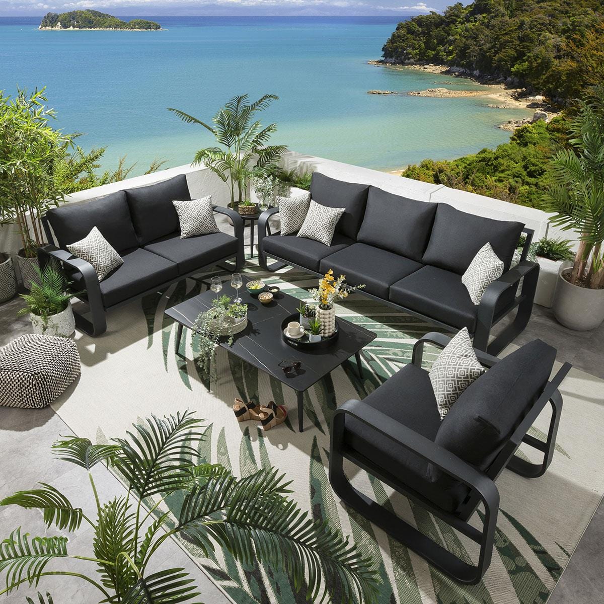 Crafted for durability, Freddy's full aluminium composition guarantees weather-resistance and longevity, making it the perfect outdoor sofa for any season. The chunky proportions offer unparalleled comfort, striking the ideal balance between style and support. The sleek black frame with a textured finish enhances the luxurious feel of this garden sofa.