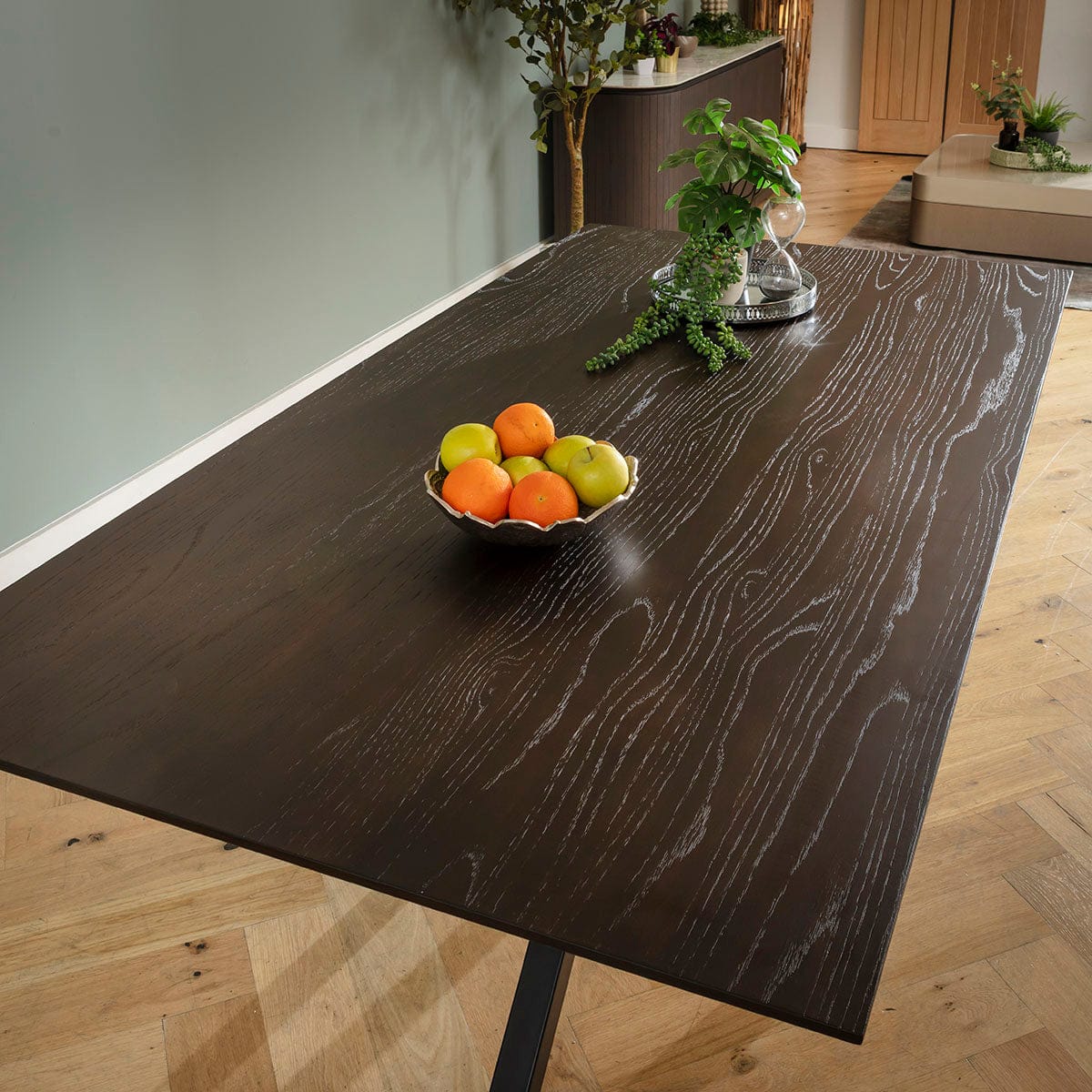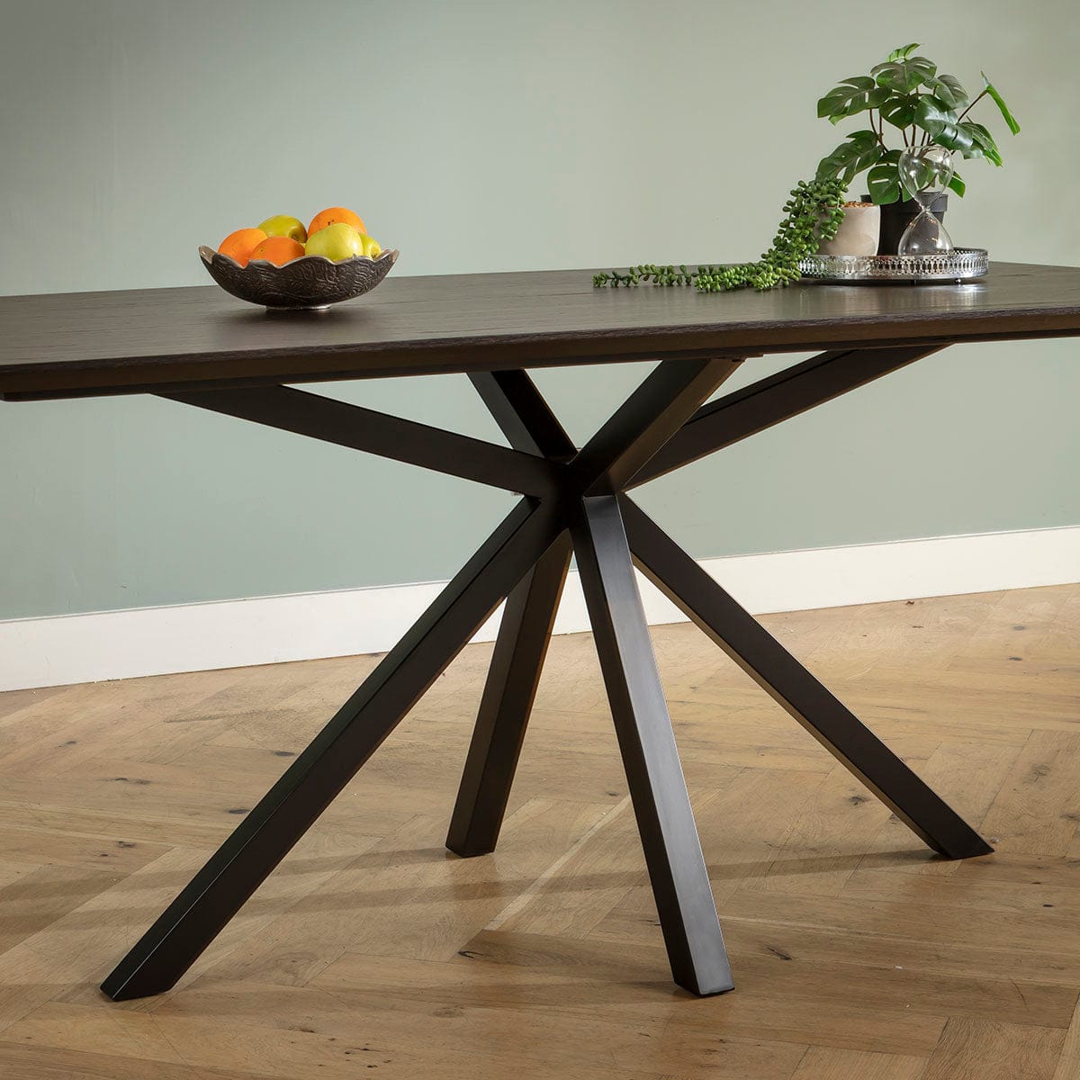 This modern 6 seater dining table combines contemporary design with practical functionality, ideal for contemporary interiors. Featuring a dark oak veneer top and sleek black metal star base, this oak dining table offers a tactile, visually appealing surface. Its spacious dimensions create a comfortable six-seater arrangement, making it a standout piece in any modern dining room setting.