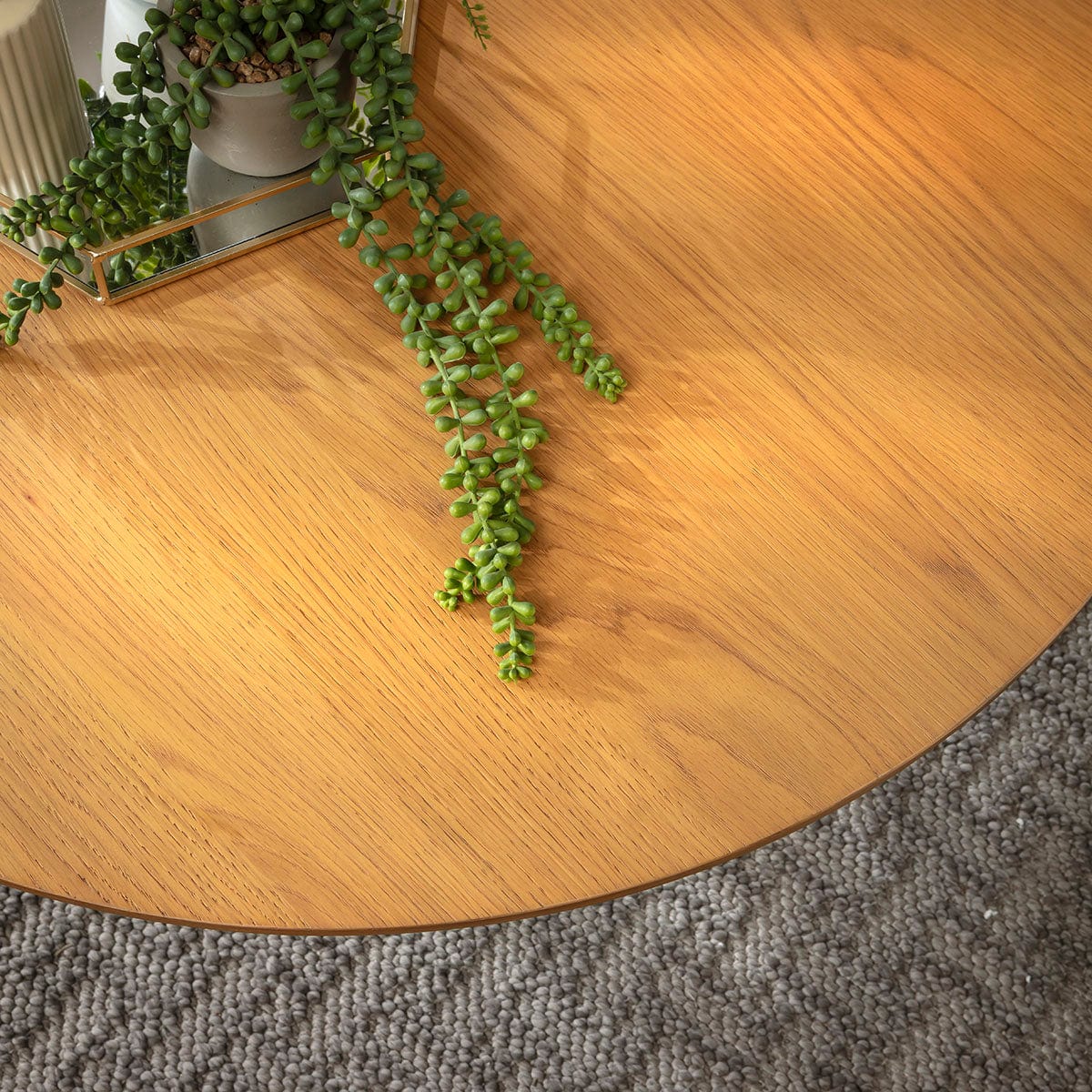 Constructed from quality materials, this round coffee table blends durability with luxury. The light wooden top features a premium oak veneer with a tactile grain for a sophisticated touch. Supporting this surface, sturdy metal legs with a black painted finish provide long-lasting stability while elevating the overall modern wooden coffee table style.