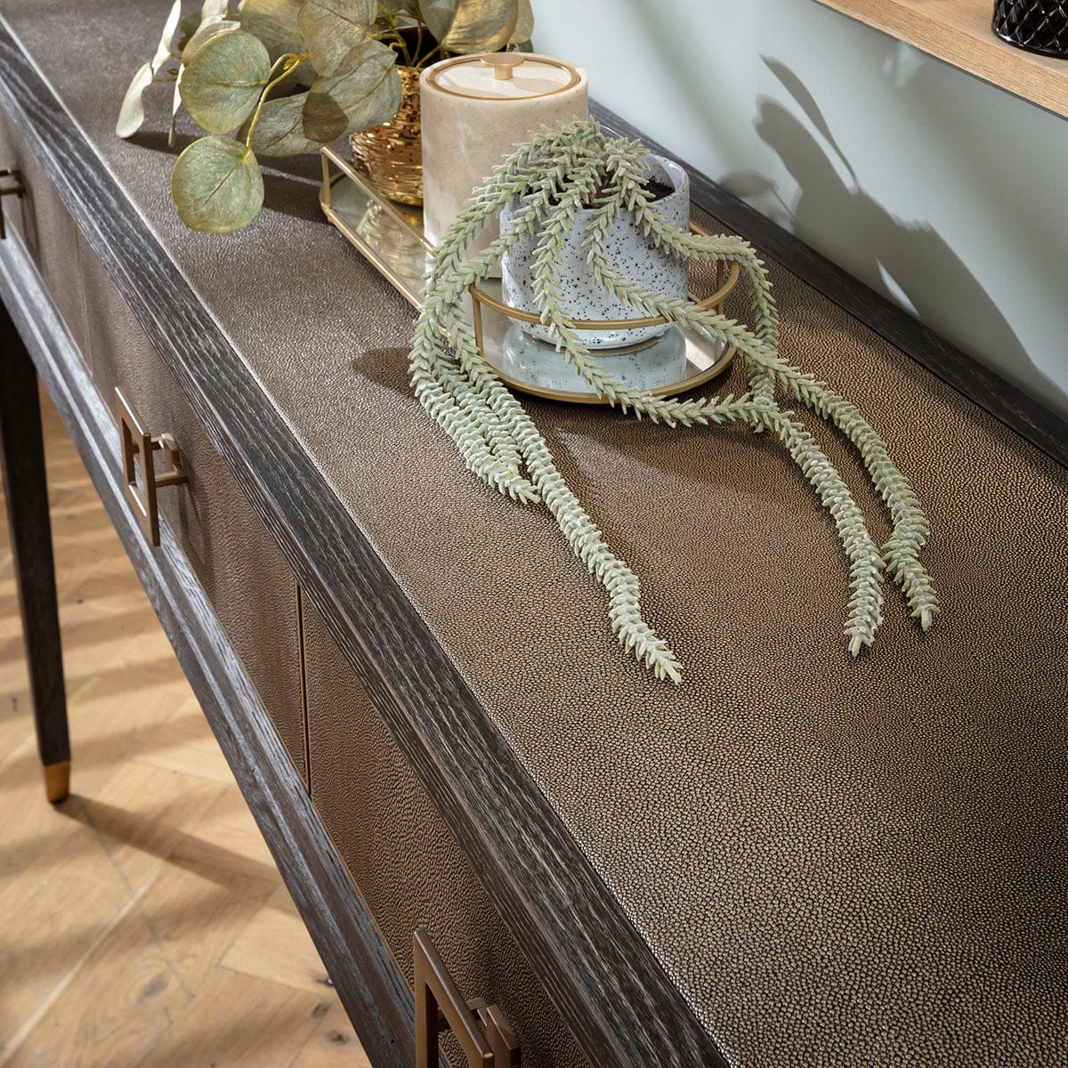 From the Bloomville collection by Richmond Interiors, this 3 drawer console table features a modern, rustic aesthetic. The wood frame is enhanced with shagreen PU leather and antique gold metal accents. Its contemporary design highlights premium furniture quality, creating a bold statement while offering practical storage for living rooms, hallways, or entrances.