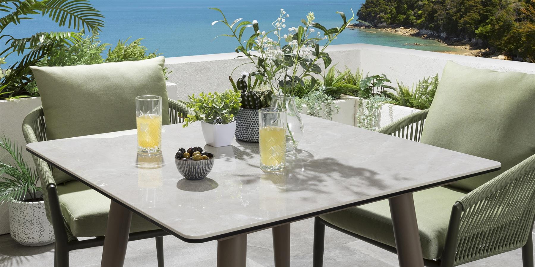 Our hard-wearing and spacious ceramic 90cm square garden dining table makes a perfect addition to any contemporary, modern or minimalist outdoors, providing enough space for up to 4 people to enjoy dining in comfort. Made from robust and ultra-durable ceramic in a natural smooth light grey marble-effect finish, atop a hard-wearing beige aluminium metal frame.