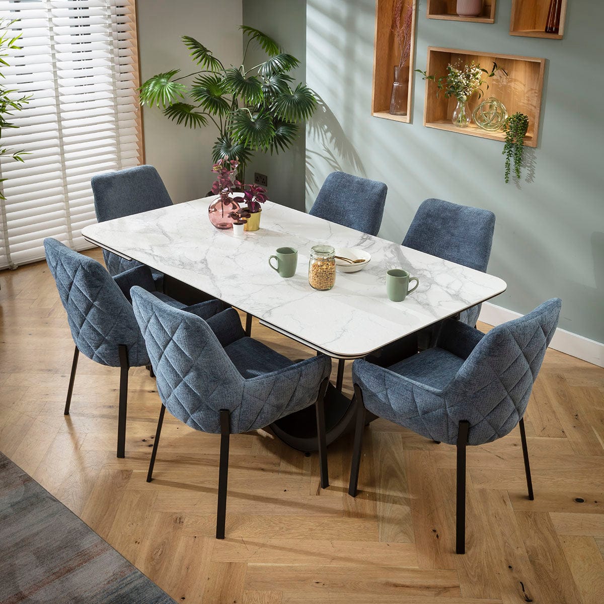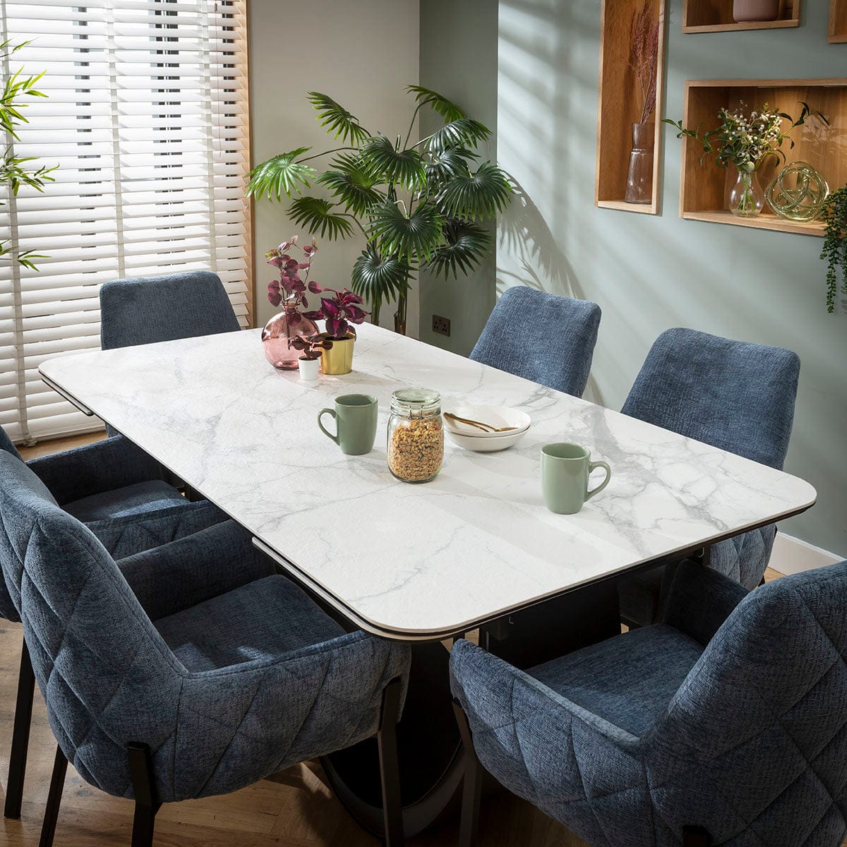 Cora & Hugo Modern 6 Seater Extendable Dining Set Blue Chenille & Matte White Ceramic