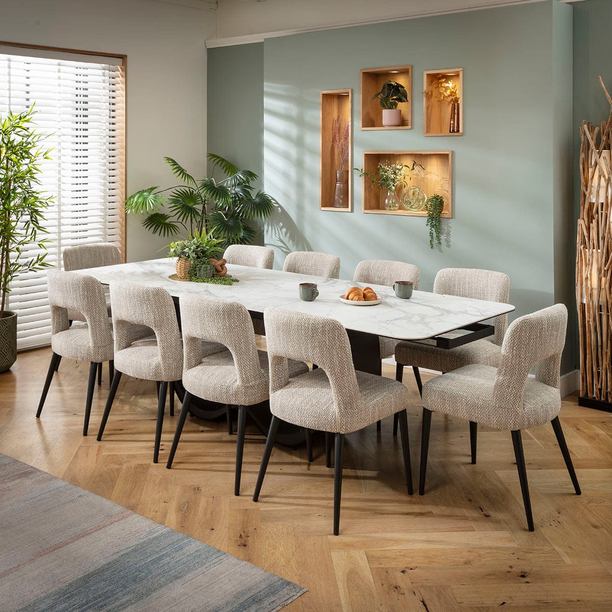 This 10 seater dining table and chair set includes an extendable dining table combining a white ceramic top with a metal pedestal base, with brown dining chairs in a durable woven fabric, sleek black metal legs and a slim silhouette. This modern dining set is crafted for durability and comfort.