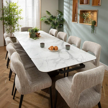 Elevate your dining space with the Hugo white extendable dining table - where elegance meets innovation. Extending effortlessly from 180cm to 260cm to seat 10, it features a matte white ceramic top with a grey-veined marble effect that’s scratch, stain, and heat resistant. The striking wave-shaped pedestal base in dark glitter grey metal adds a sculptural touch. With its smooth, one-handed mechanism, the extension leaves glide out and fold away with ease - a seamless blend of style, durability, and practicality.