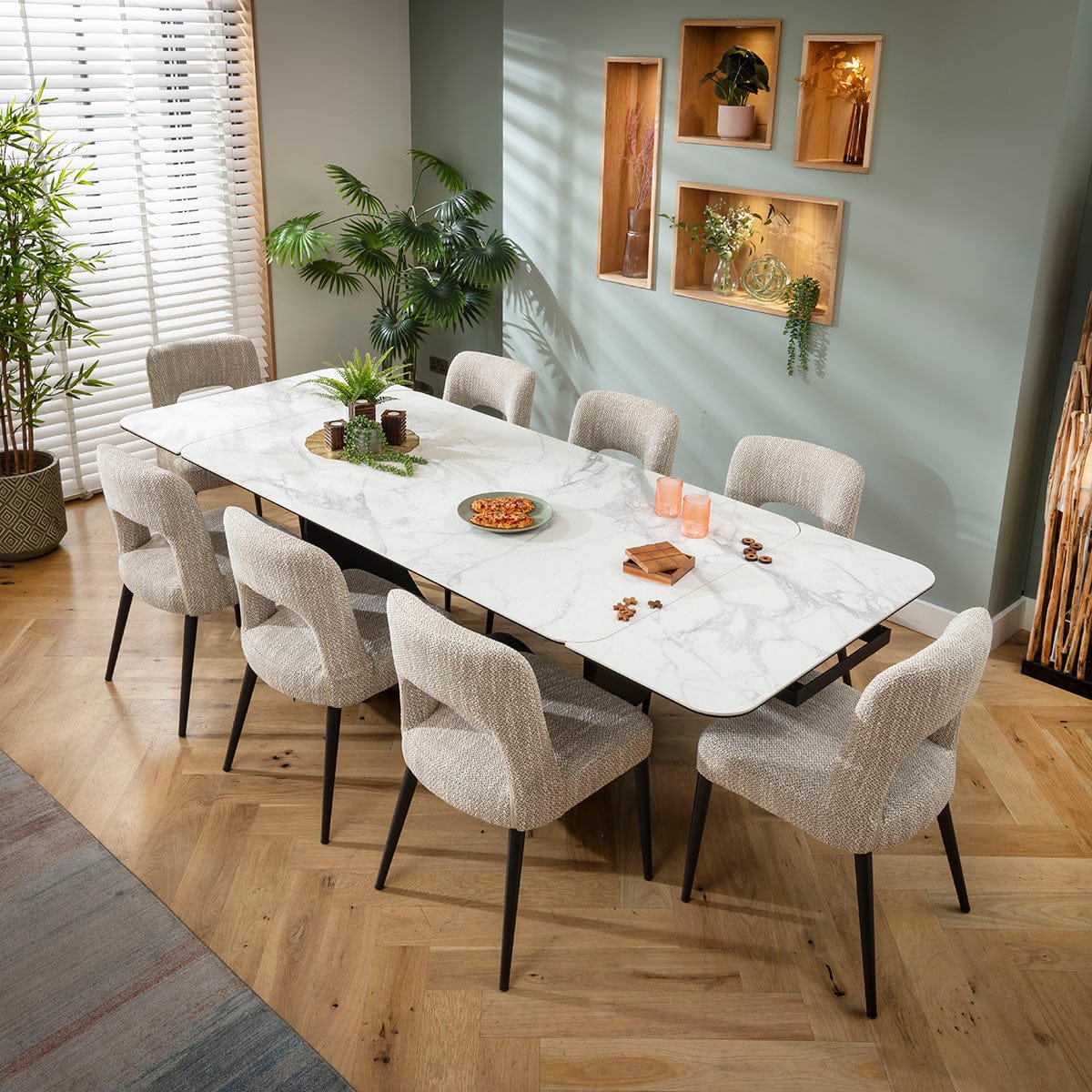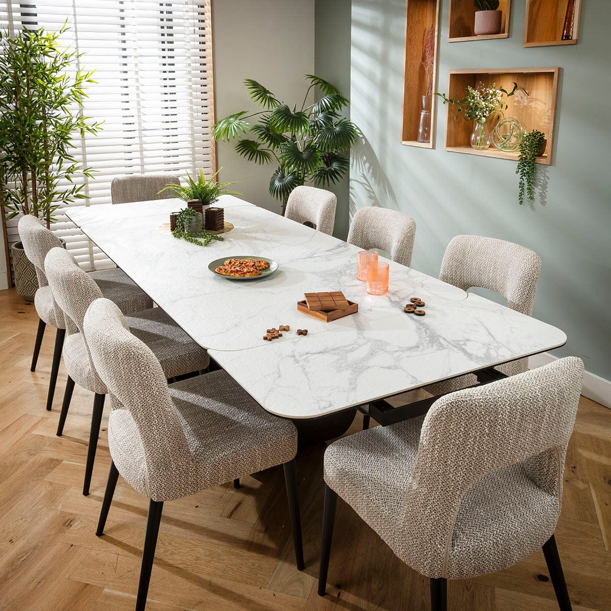Elevate your dining space with the Hugo white extendable dining table - where elegance meets innovation. Extending effortlessly from 180cm to 260cm to seat 8, it features a matte white ceramic top with a grey-veined marble effect that’s scratch, stain, and heat resistant. The striking wave-shaped pedestal base in dark glitter grey metal adds a sculptural touch. With its smooth, one-handed mechanism, the extension leaves glide out and fold away with ease - a seamless blend of style, durability, and practicality.