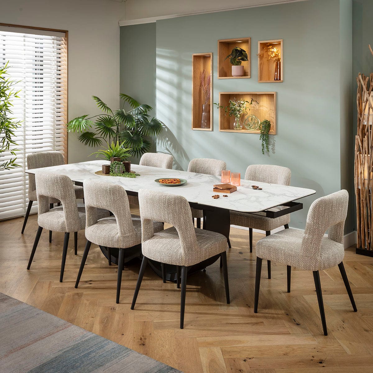 This 8 seater dining table and chair set includes an extendable dining table combining a white ceramic top with a metal pedestal base, with brown dining chairs in a durable woven fabric, sleek black metal legs and a slim silhouette. This modern dining set is crafted for durability and comfort.