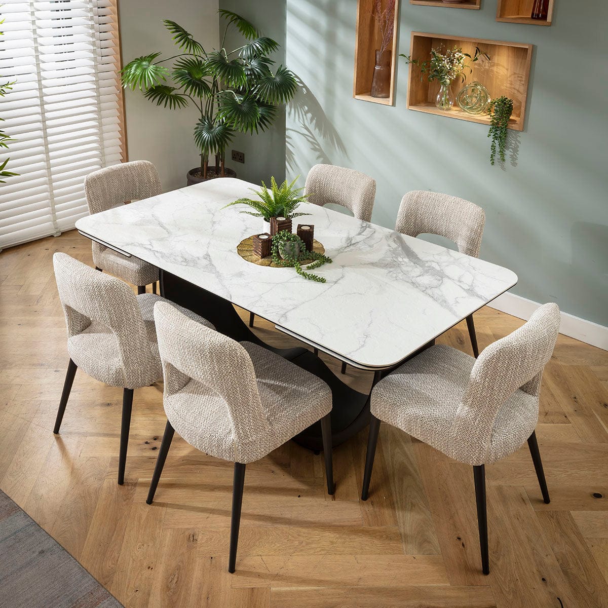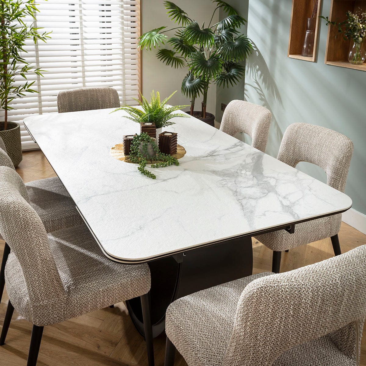 Elevate your dining space with the Hugo white extendable dining table - where elegance meets innovation. Extending effortlessly from 180cm to 260cm to seat 6, it features a matte white ceramic top with a grey-veined marble effect that’s scratch, stain, and heat resistant. The striking wave-shaped pedestal base in dark glitter grey metal adds a sculptural touch. With its smooth, one-handed mechanism, the extension leaves glide out and fold away with ease - a seamless blend of style, durability, and practicality.