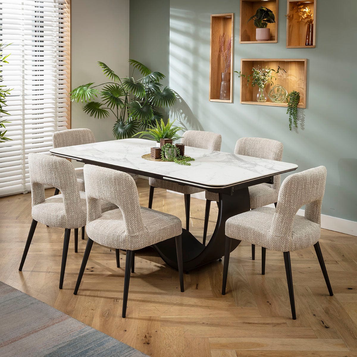 This 6 seater dining table and chair set includes an extendable dining table combining a white ceramic top with a metal pedestal base, with brown dining chairs in a durable woven fabric, sleek black metal legs and a slim silhouette. This modern dining set is crafted for durability and comfort.